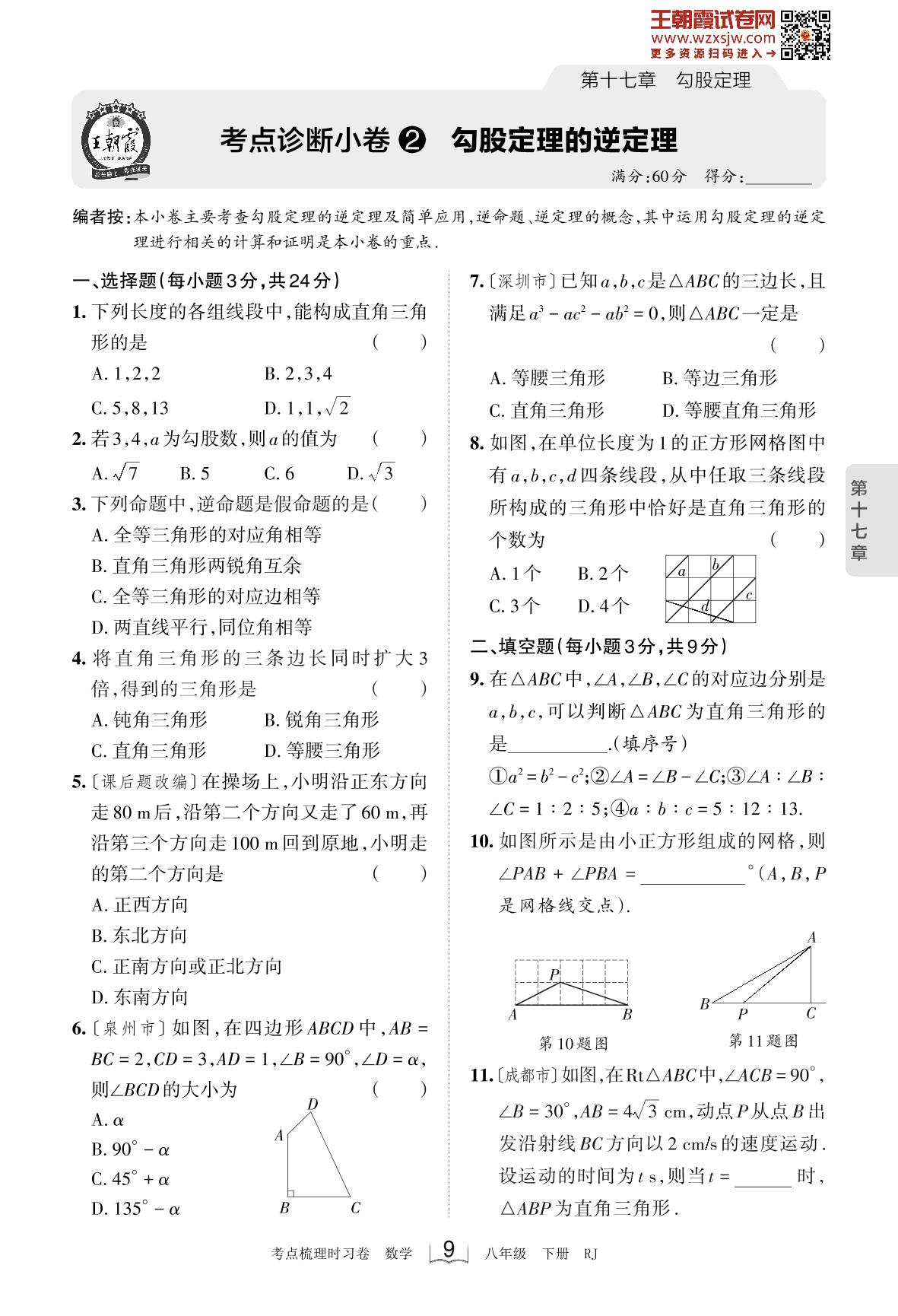 2023下册八年级数学人教版 第十七章 考点诊断小卷2 勾股定理的逆定理
