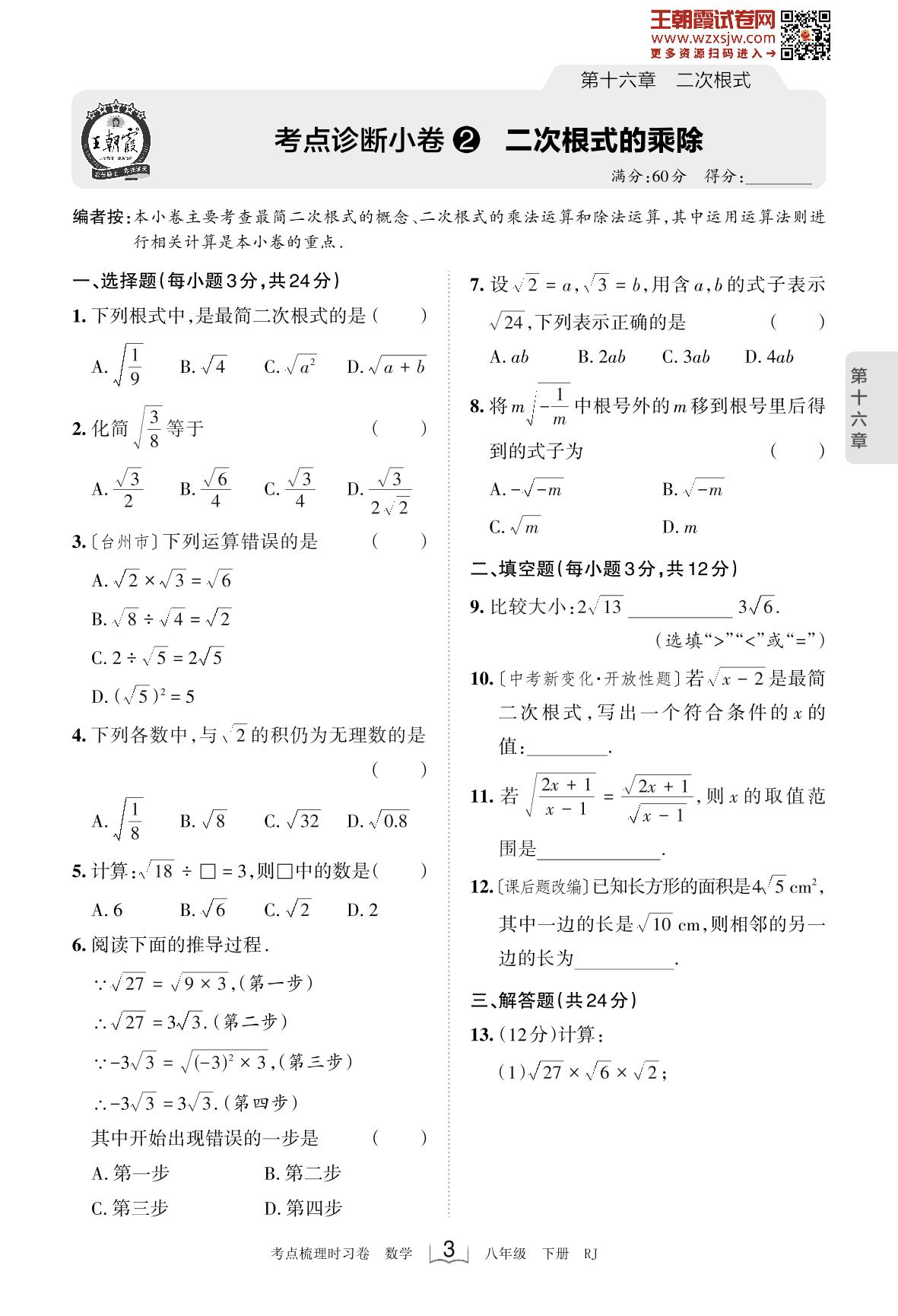 2023下册八年级数学人教版 第十六章 考点诊断小卷2 二次根式的乘除