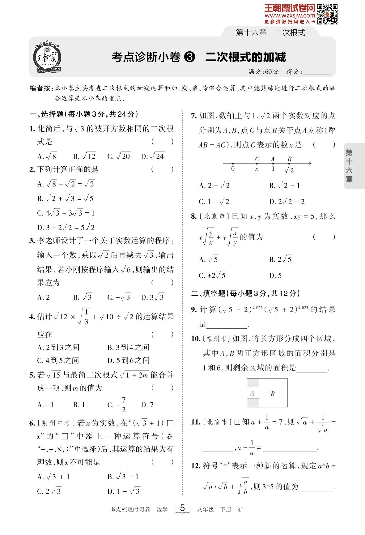 2023下册八年级数学人教版 第十六章 考点诊断小卷3 二次根式的加减