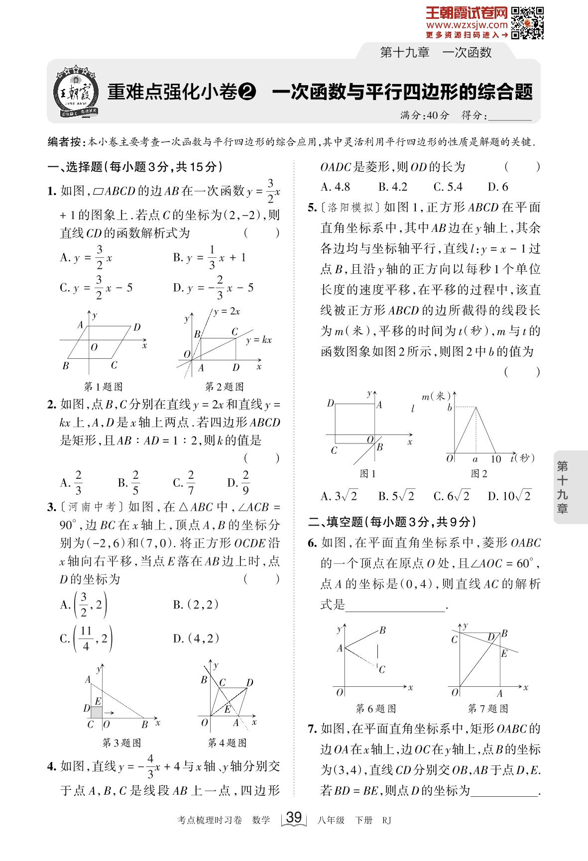 2023下册八年级数学人教版 第十九章 重难点强化小卷2 一次函数与平行四边形的综合题