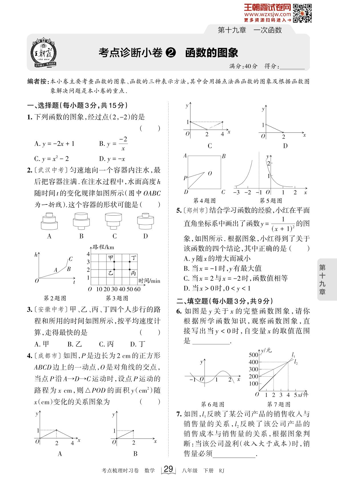 2023下册八年级数学人教版 第十九章 考点诊断小卷2 函数的图象