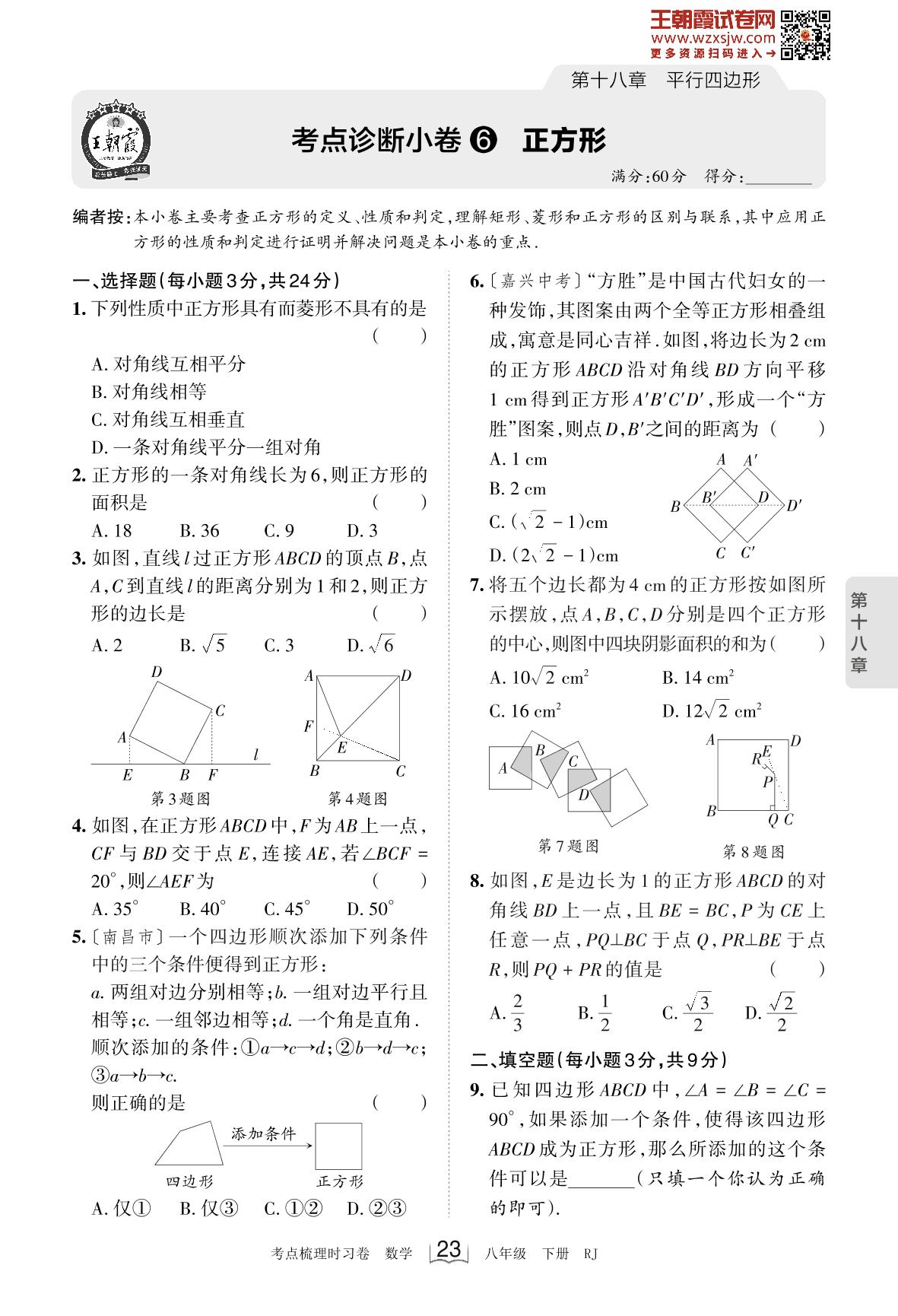 2023下册八年级数学人教版 第十八章 考点诊断小卷6 正方形