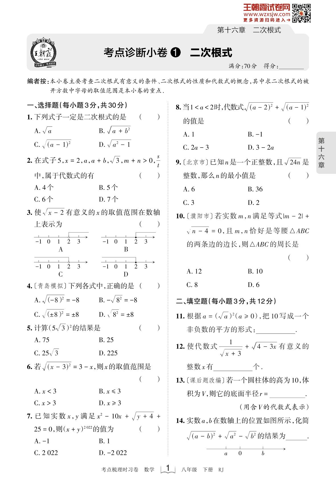 2023下册八年级数学人教版 第十六章 考点诊断小卷1 二次根式