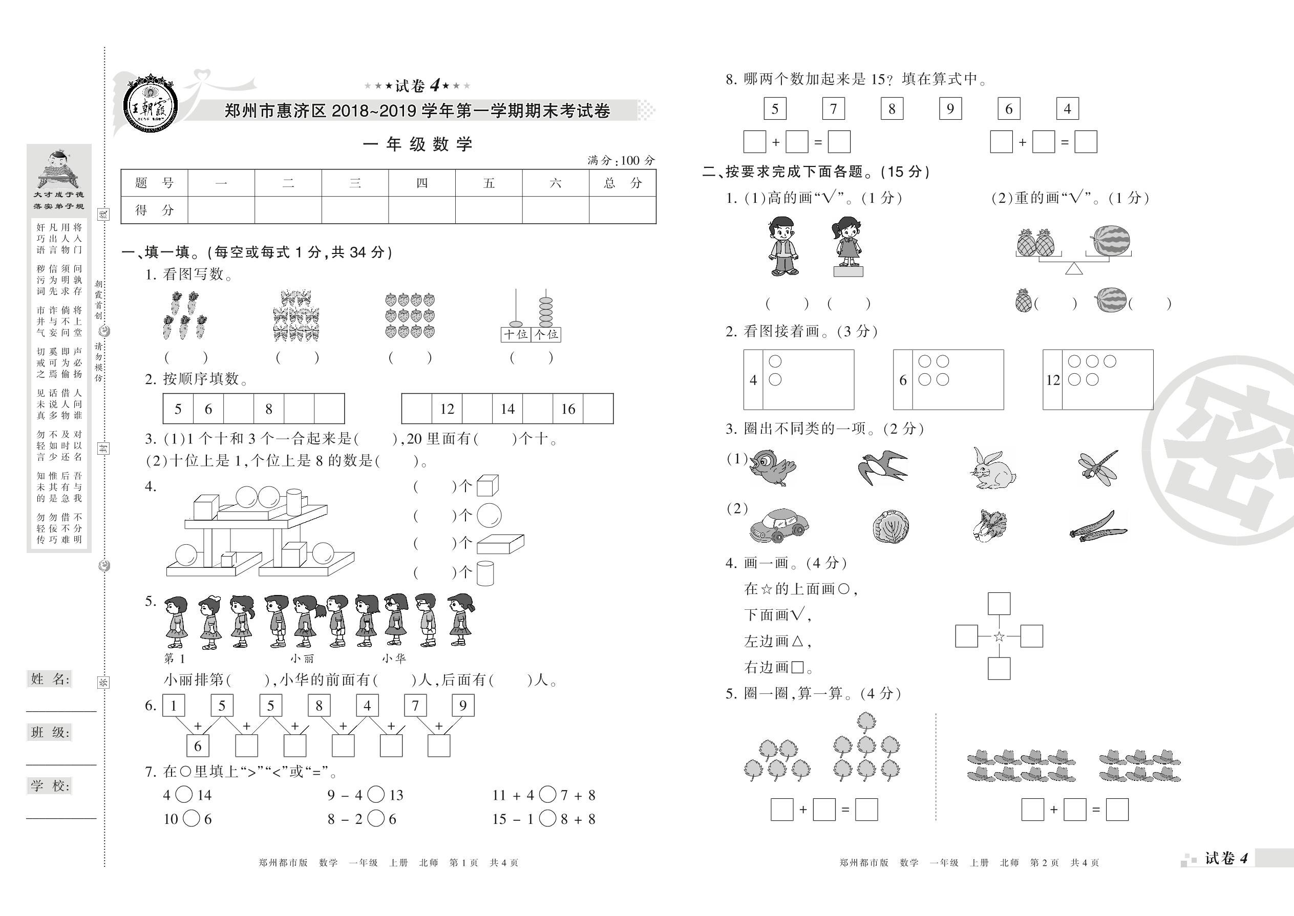 2018-2019学年第一学期郑州市惠济区一年级数学试卷(北师版)【4】