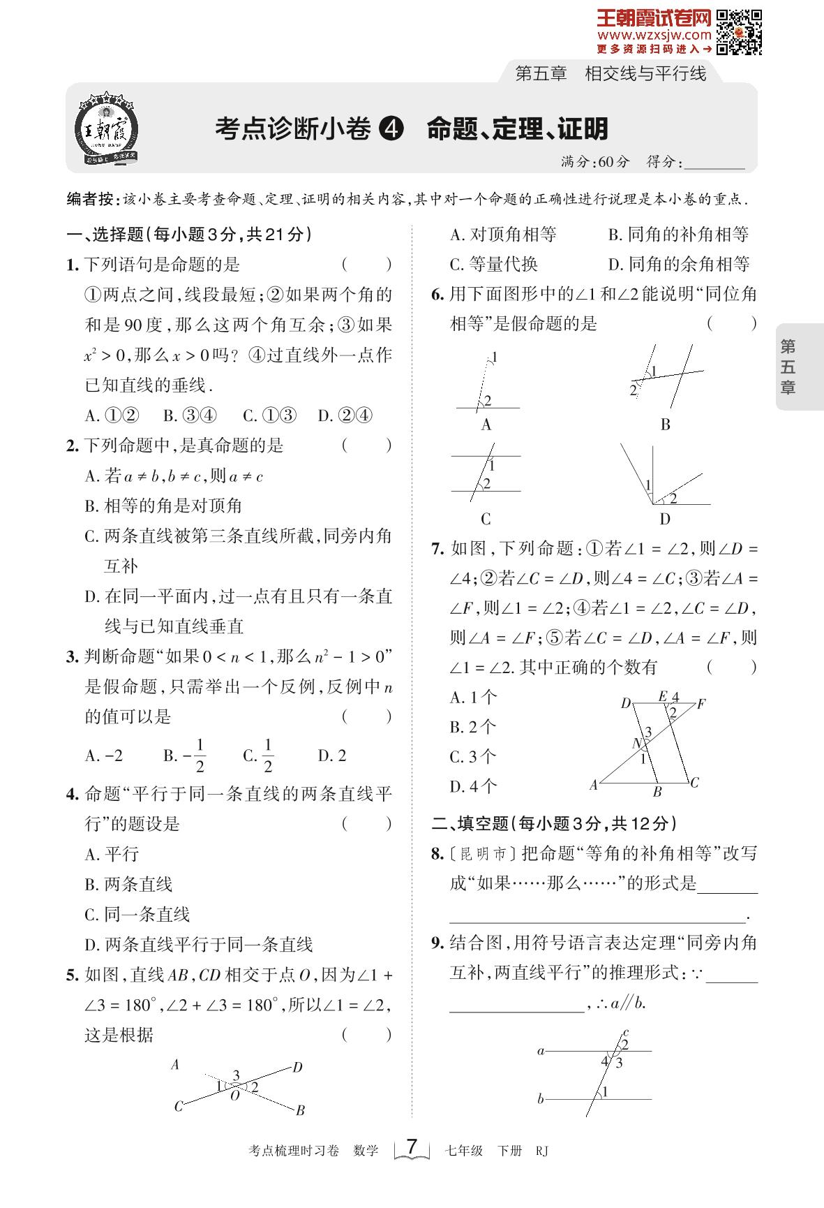 2023下册七年级数学人教版 第五章 考点诊断小卷4 命题、定理、证明