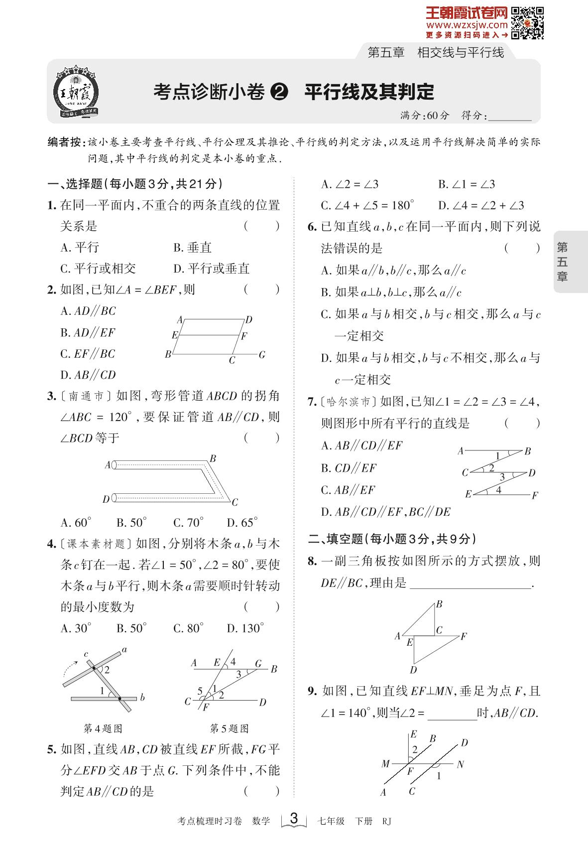 2023下册七年级数学人教版 第五章 考点诊断小卷2 平行线及其判定
