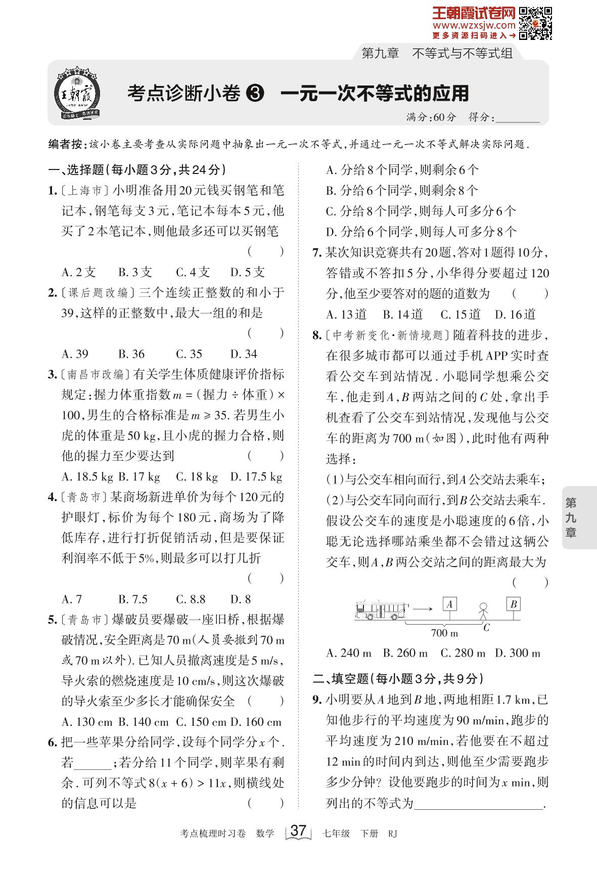 2023下册七年级数学人教版 第九章 考点诊断小卷3 一元一次不等式的应用