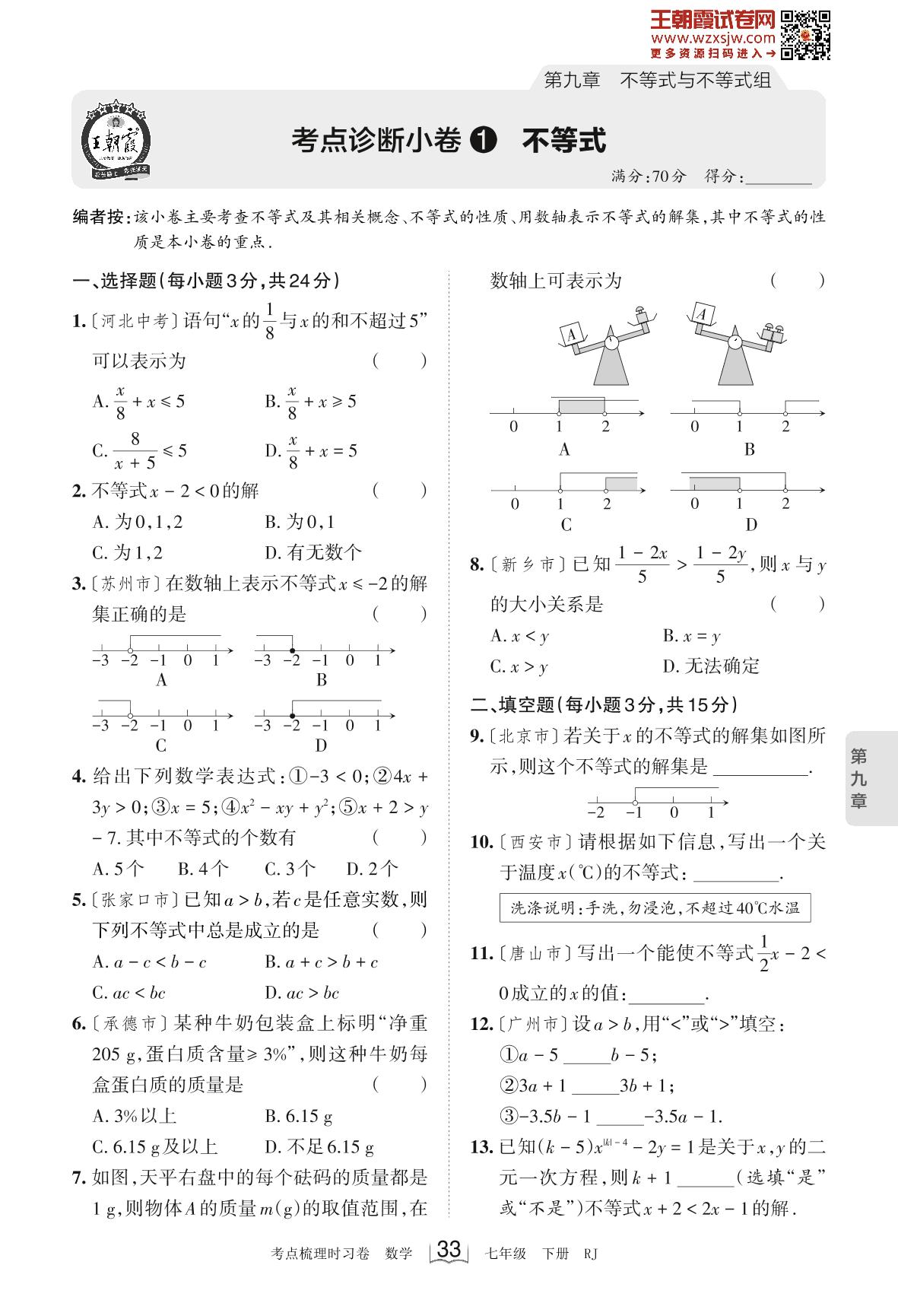2023下册七年级数学人教版 第九章 考点诊断小卷1 不等式