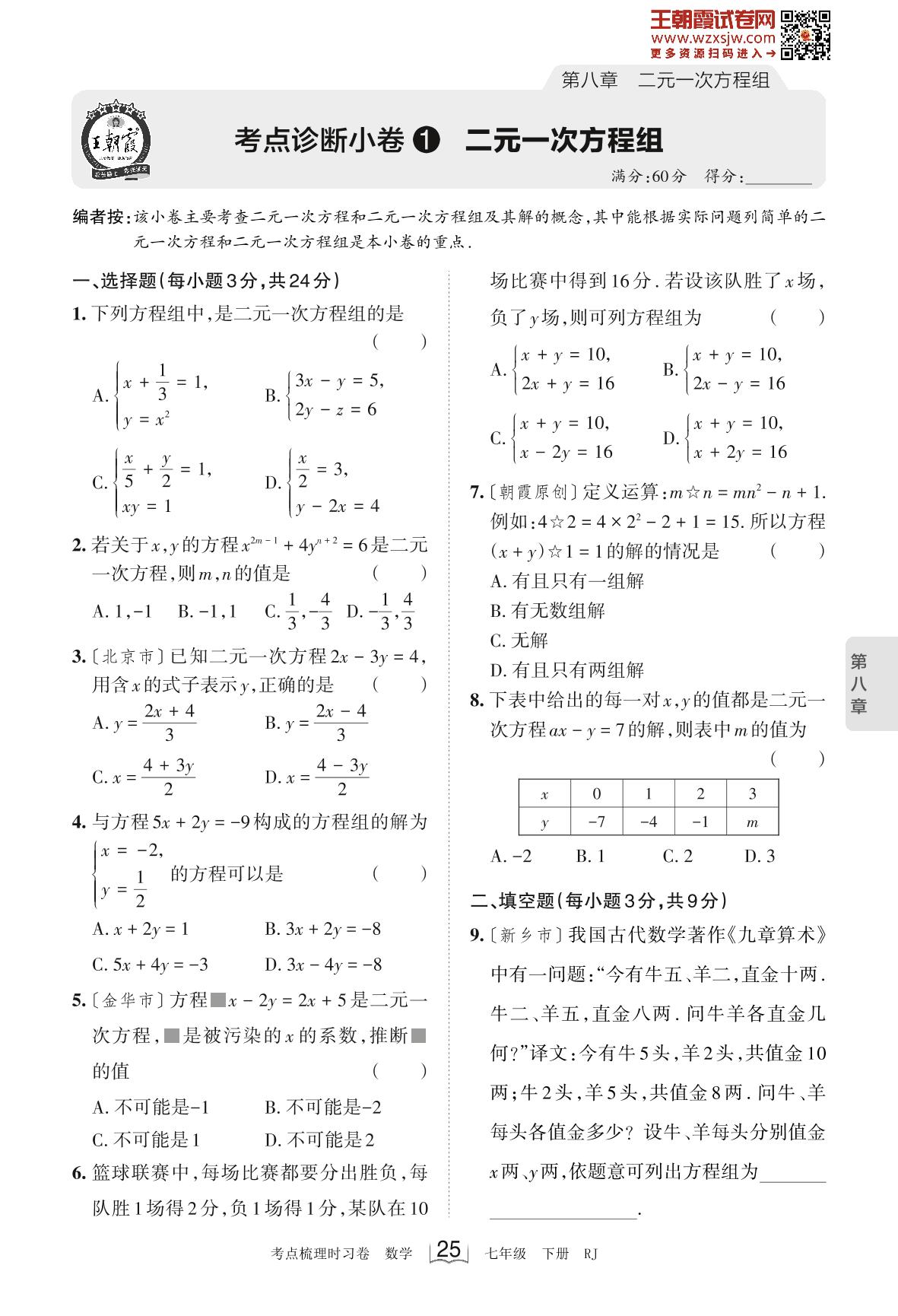 2023下册七年级数学人教版 第八章 考点诊断小卷1 二元一次方程组