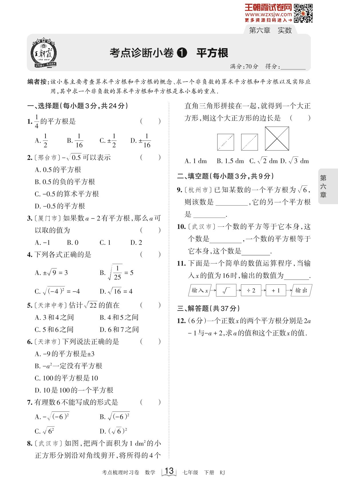 2023下册七年级数学人教版 第六章 考点诊断小卷1 平方根