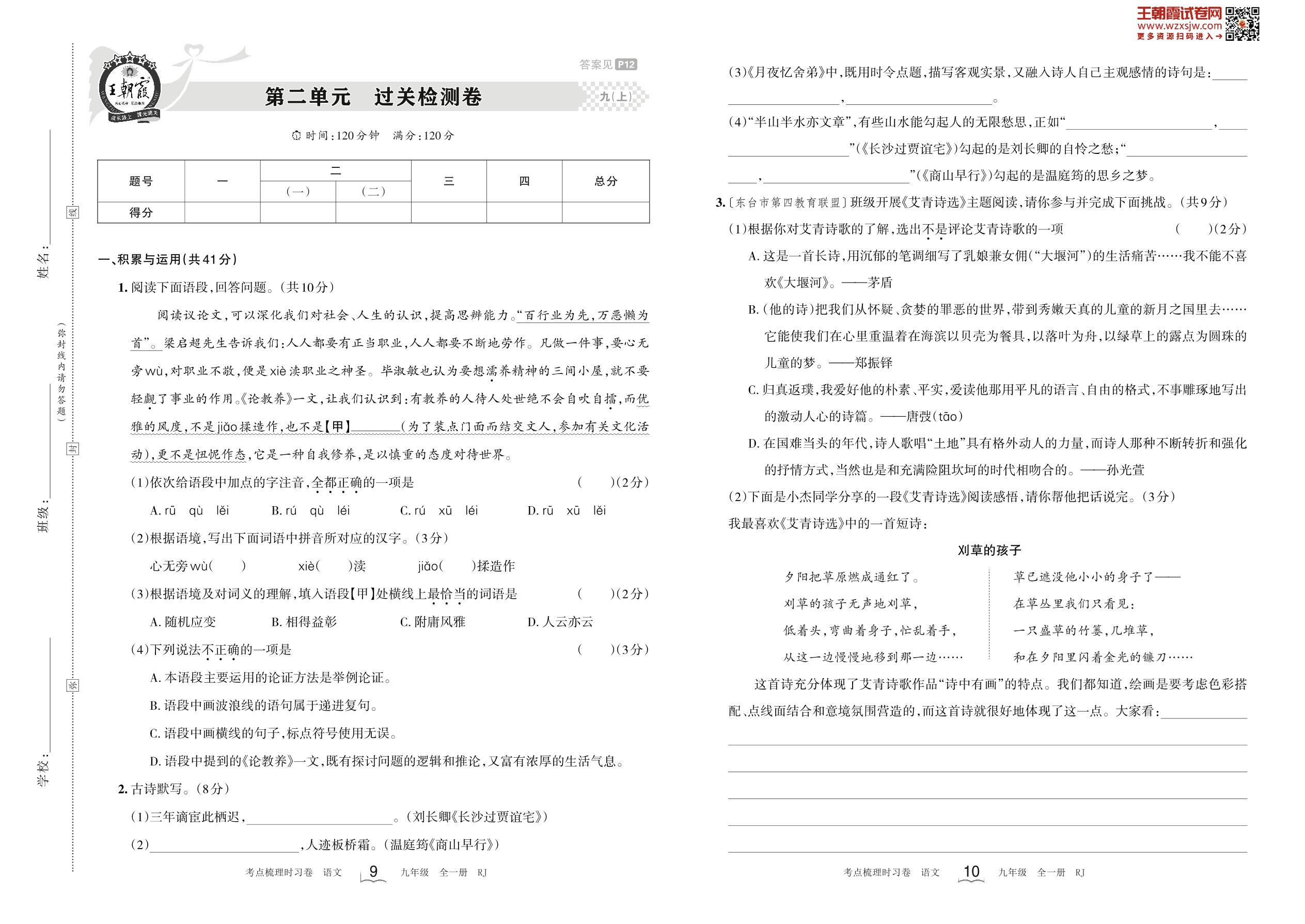 2023上册九年级语文人教版 第二单元 过关检测卷(2月版)