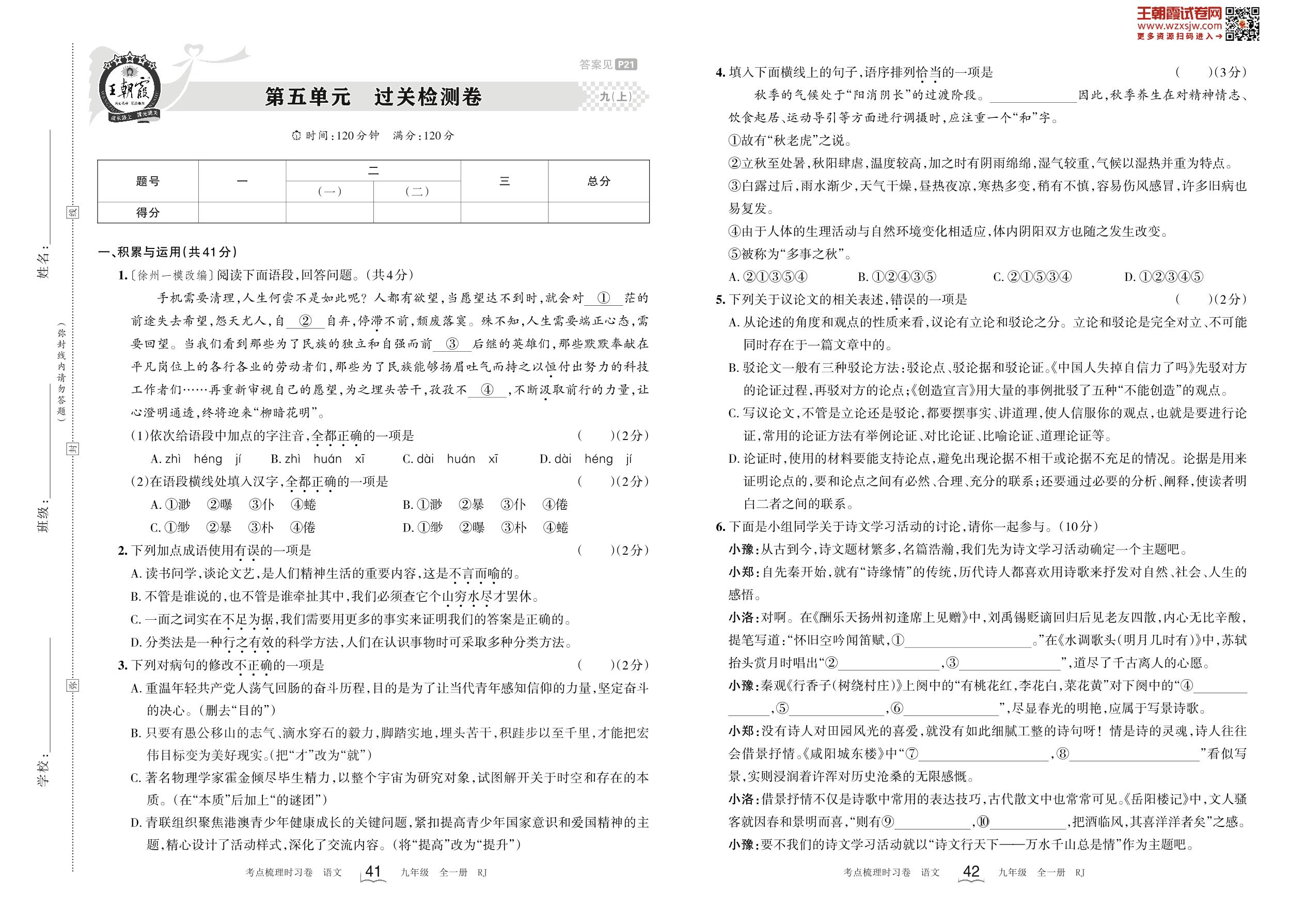 2023上册九年级语文人教版 第五单元 过关检测卷(2月版)