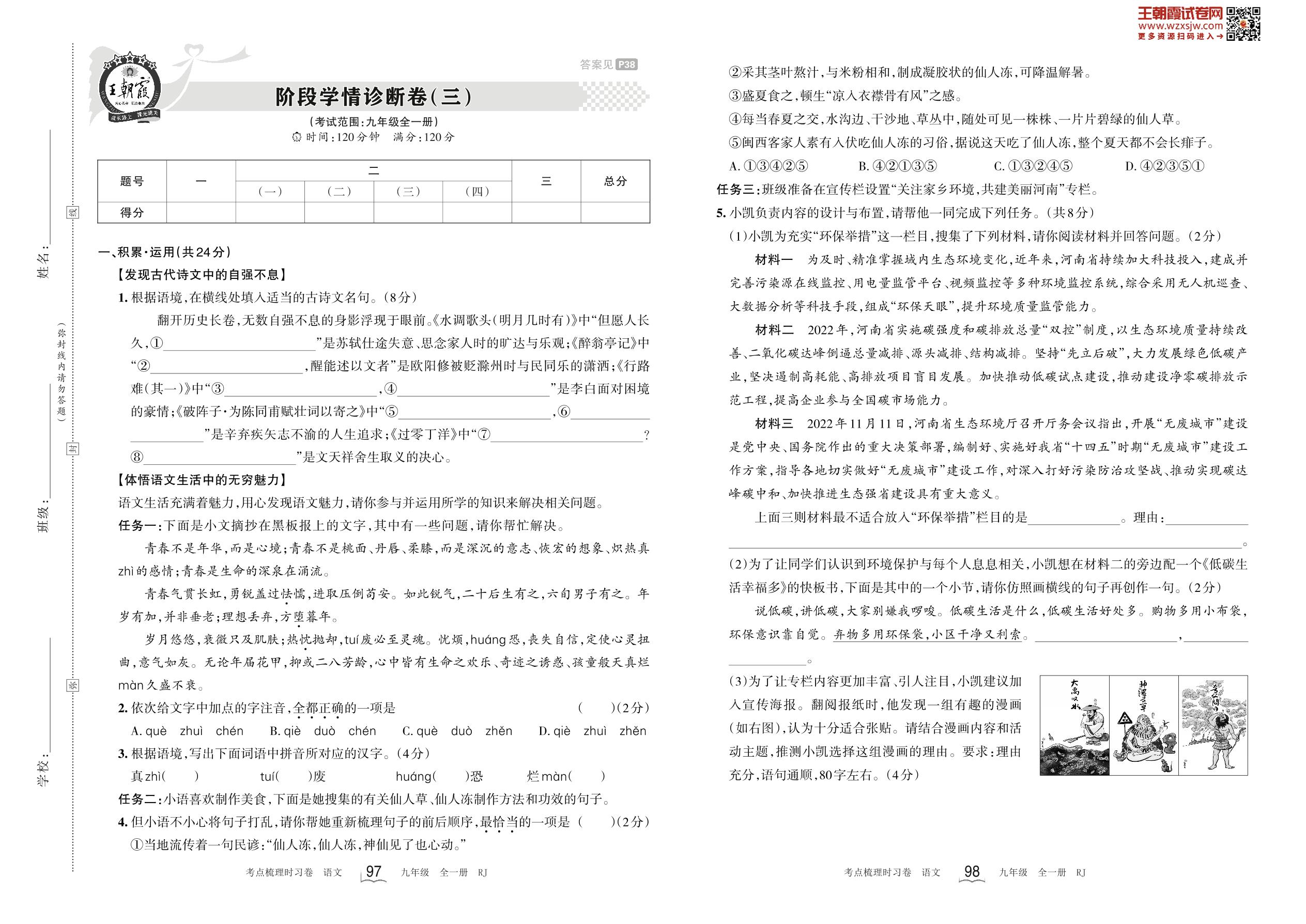 2024下册九年级语文人教版 阶段学情诊断卷(三)(2月版)