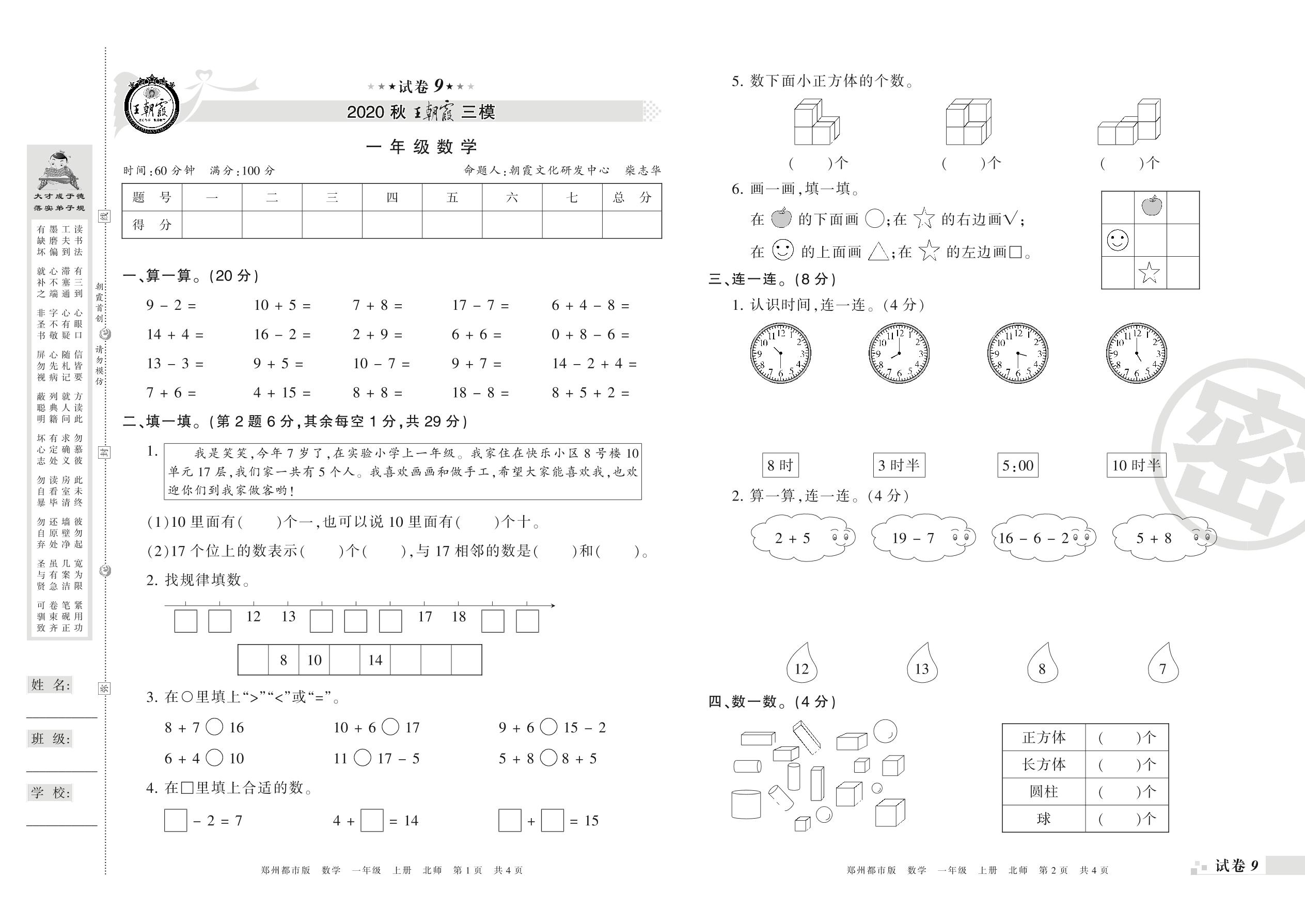 王朝霞期末模拟卷一年级上册数学(北师版)_R210802212615【9】