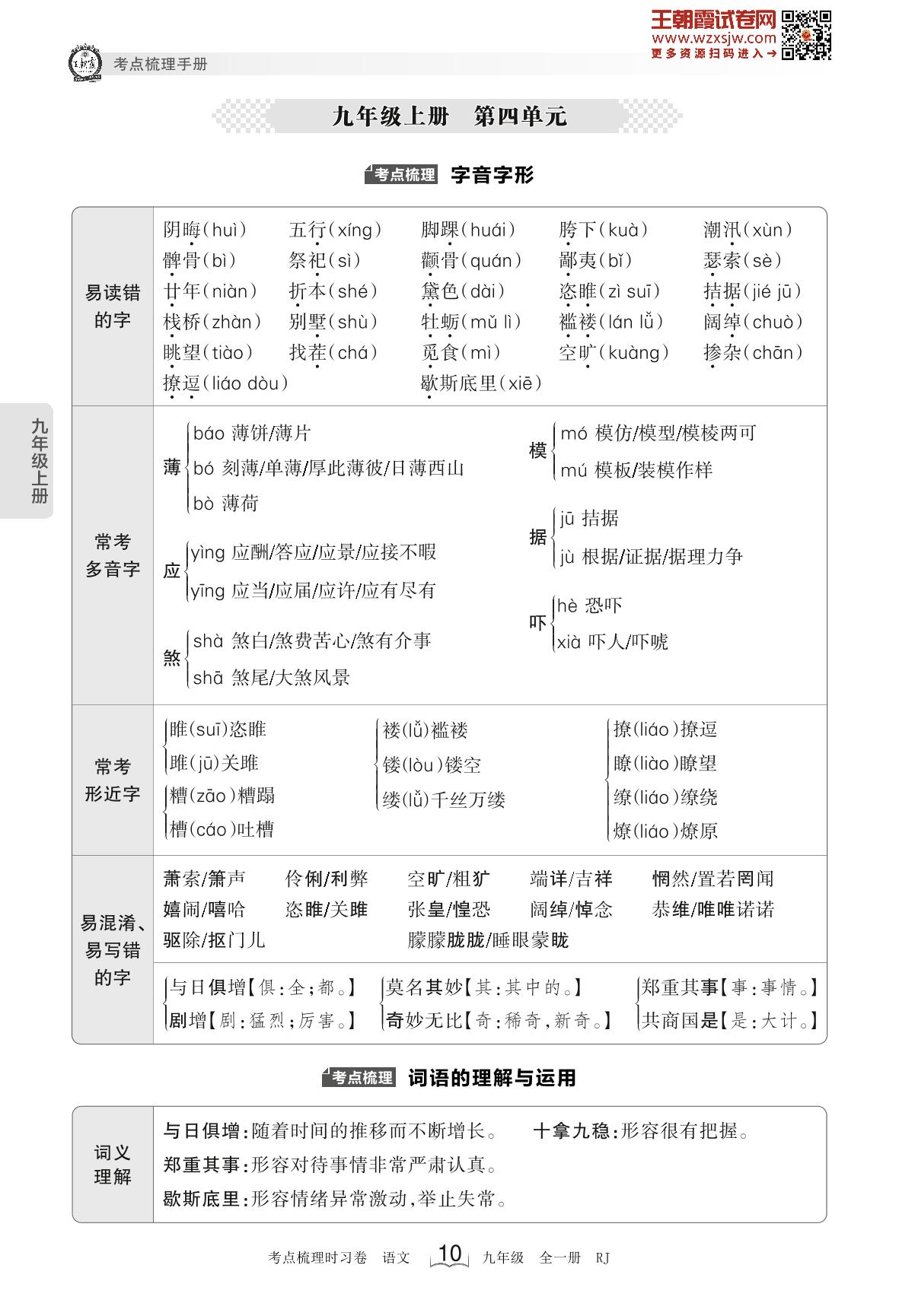 2023上册九年级语文人教版 考点梳理手册——九年级上册 第四单元(2月版)