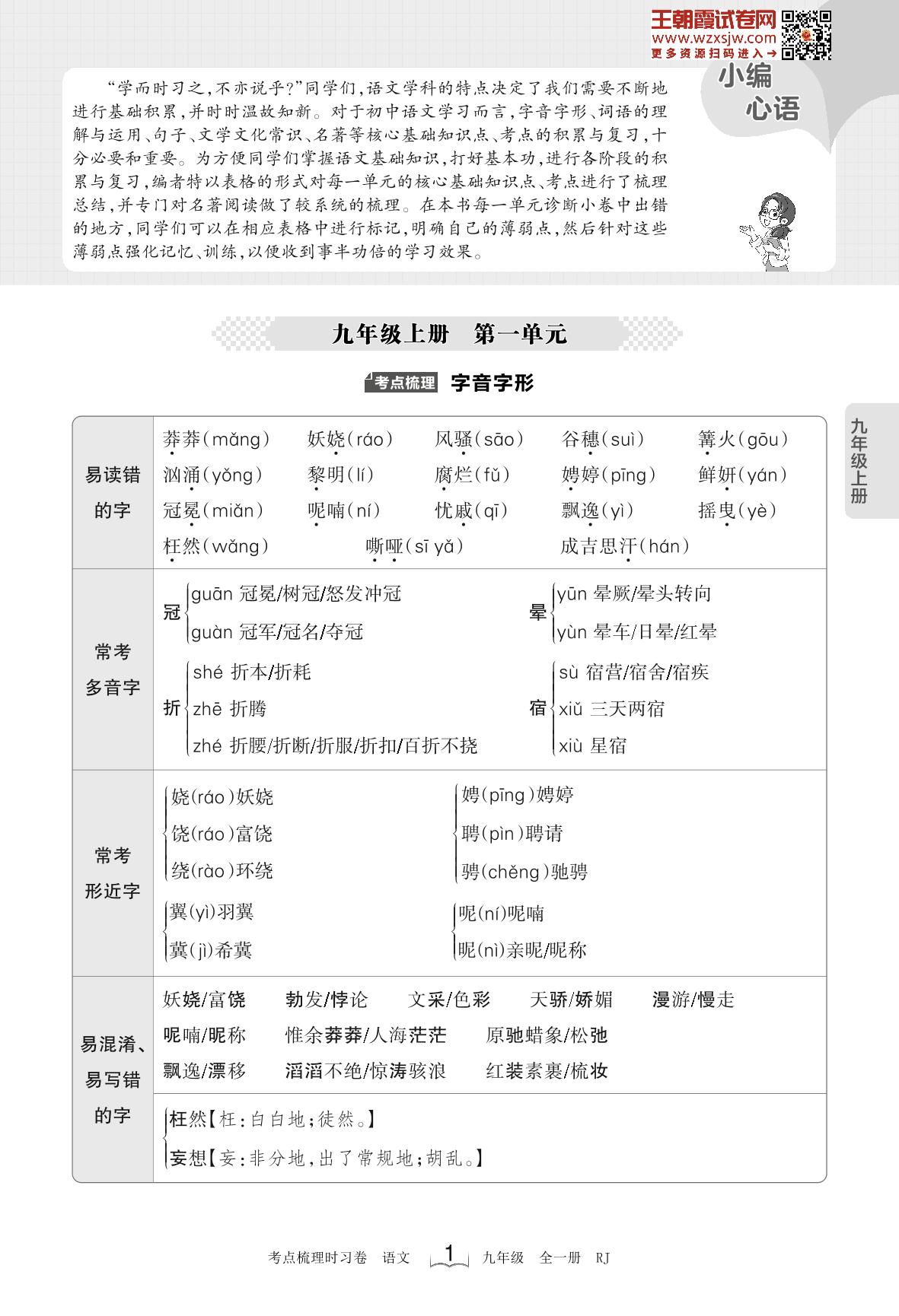 2023上册九年级语文人教版 考点梳理手册——九年级上册 第一单元(2月版)