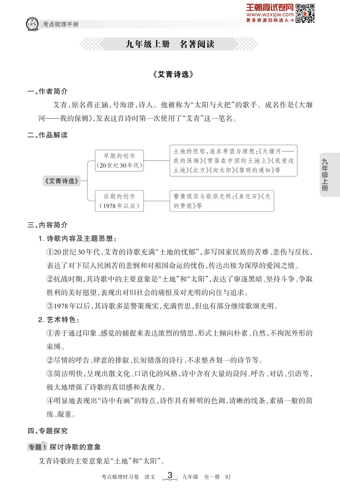 2023上册九年级语文人教版 考点梳理手册——九年级上册 名著阅读《艾青诗选》(2月版)