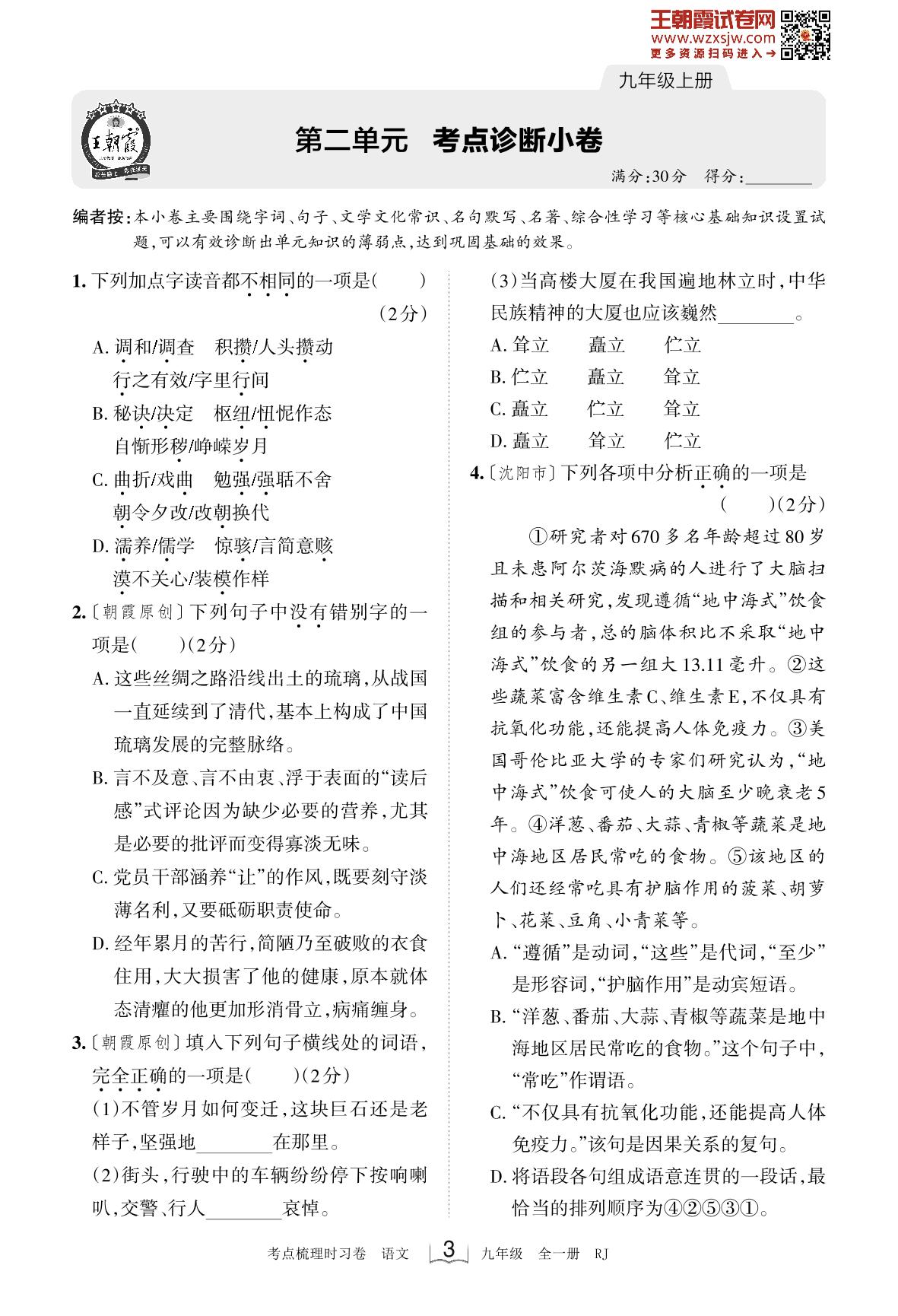 2023上册九年级语文人教版 第二单元 考点诊断小卷(2月版)