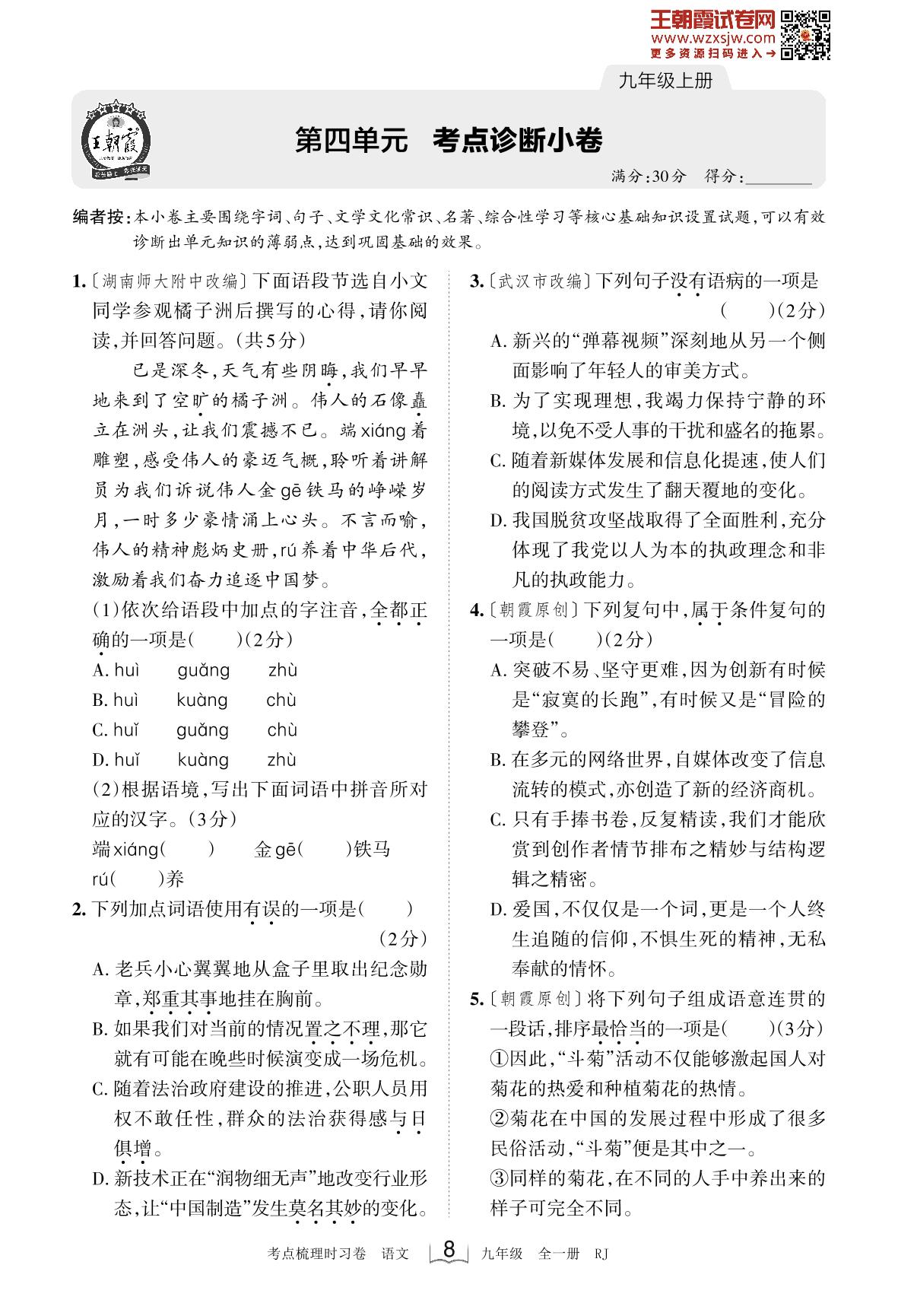 2023上册九年级语文人教版 第四单元 考点诊断小卷(2月版)