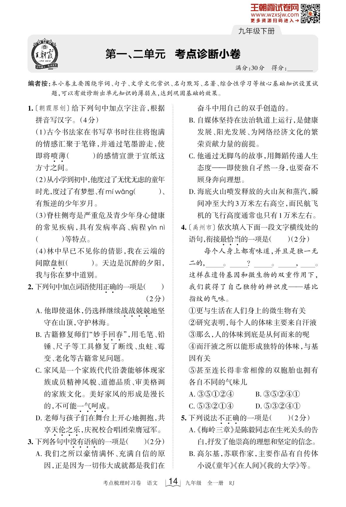 2024下册九年级语文人教版 第一、二单元 考点诊断小卷(2月版)