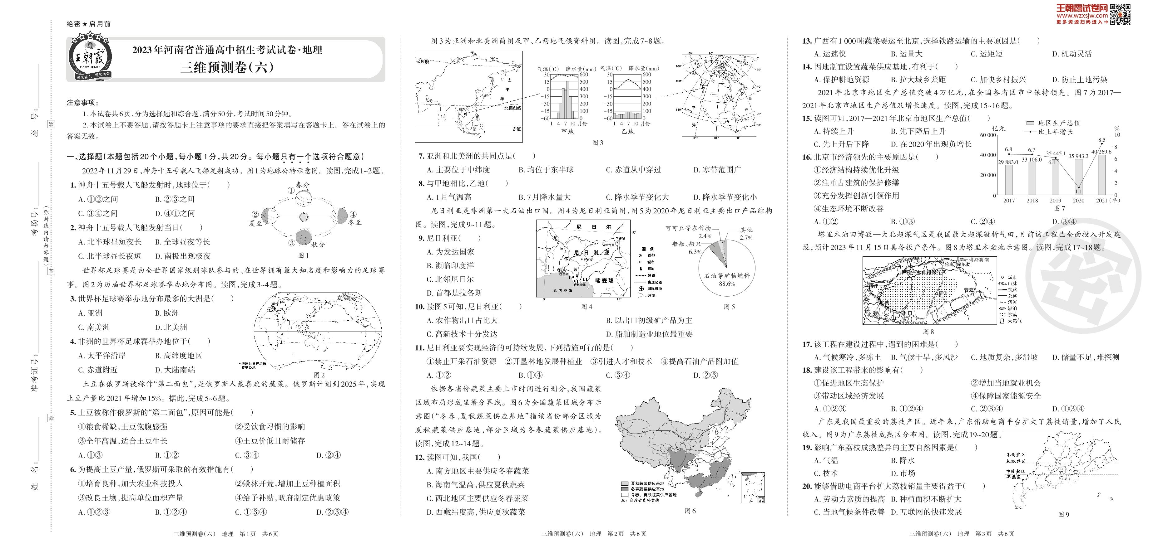 2023年河南省普通高中招生考试试卷·地理 三维预测卷(六)
