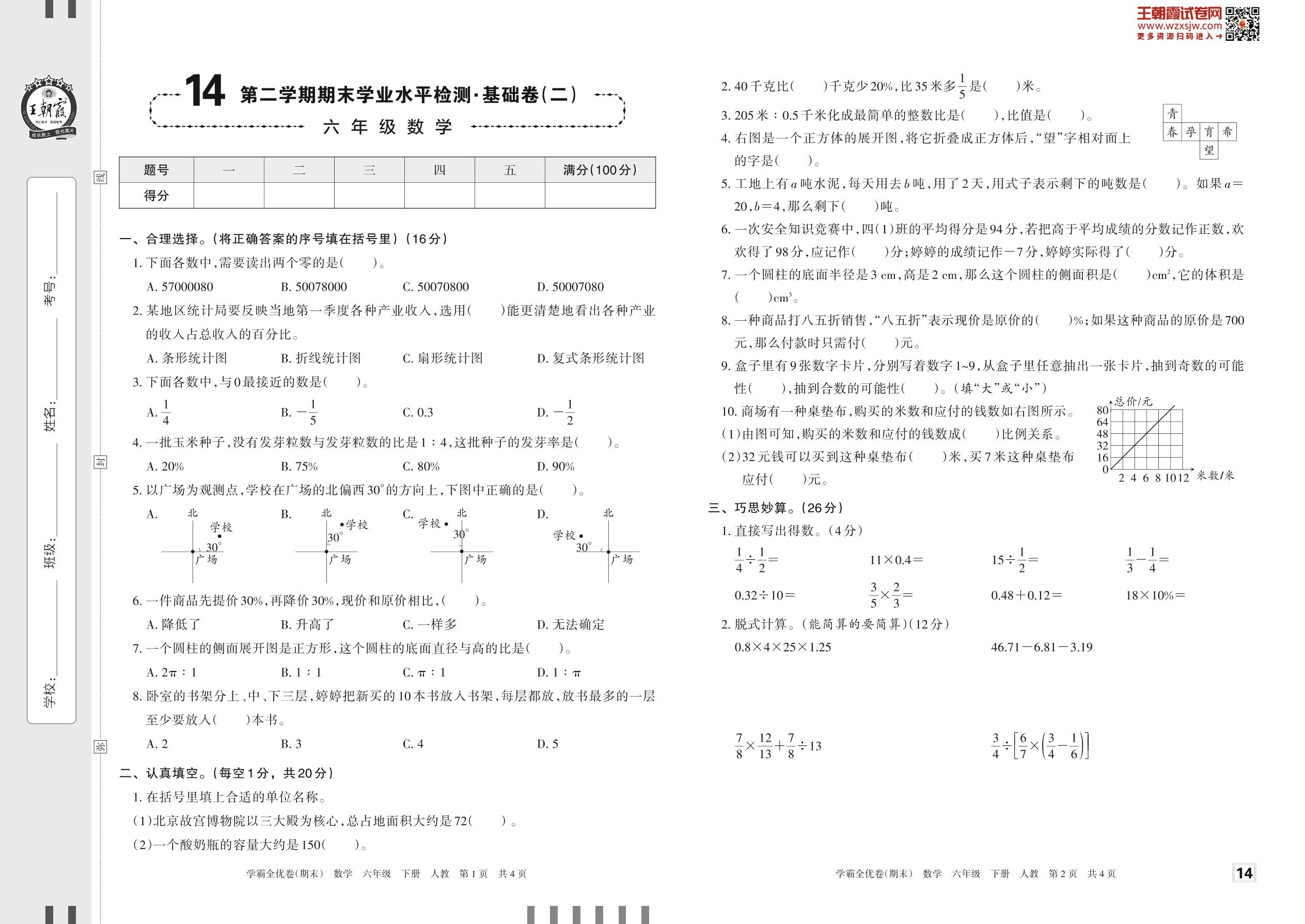 2023下册六年级数学人教版 14 第二学期期末学业水平检测·基础卷(二)