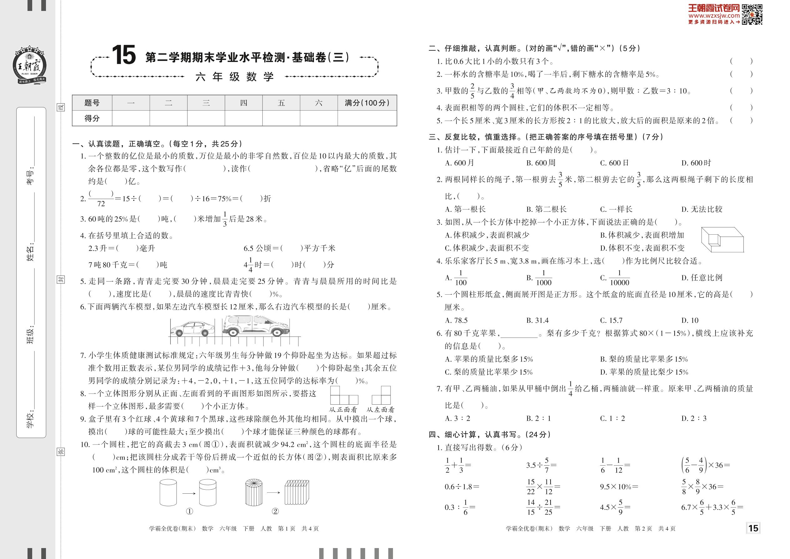 2023下册六年级数学人教版 15 第二学期期末学业水平检测·基础卷(三)