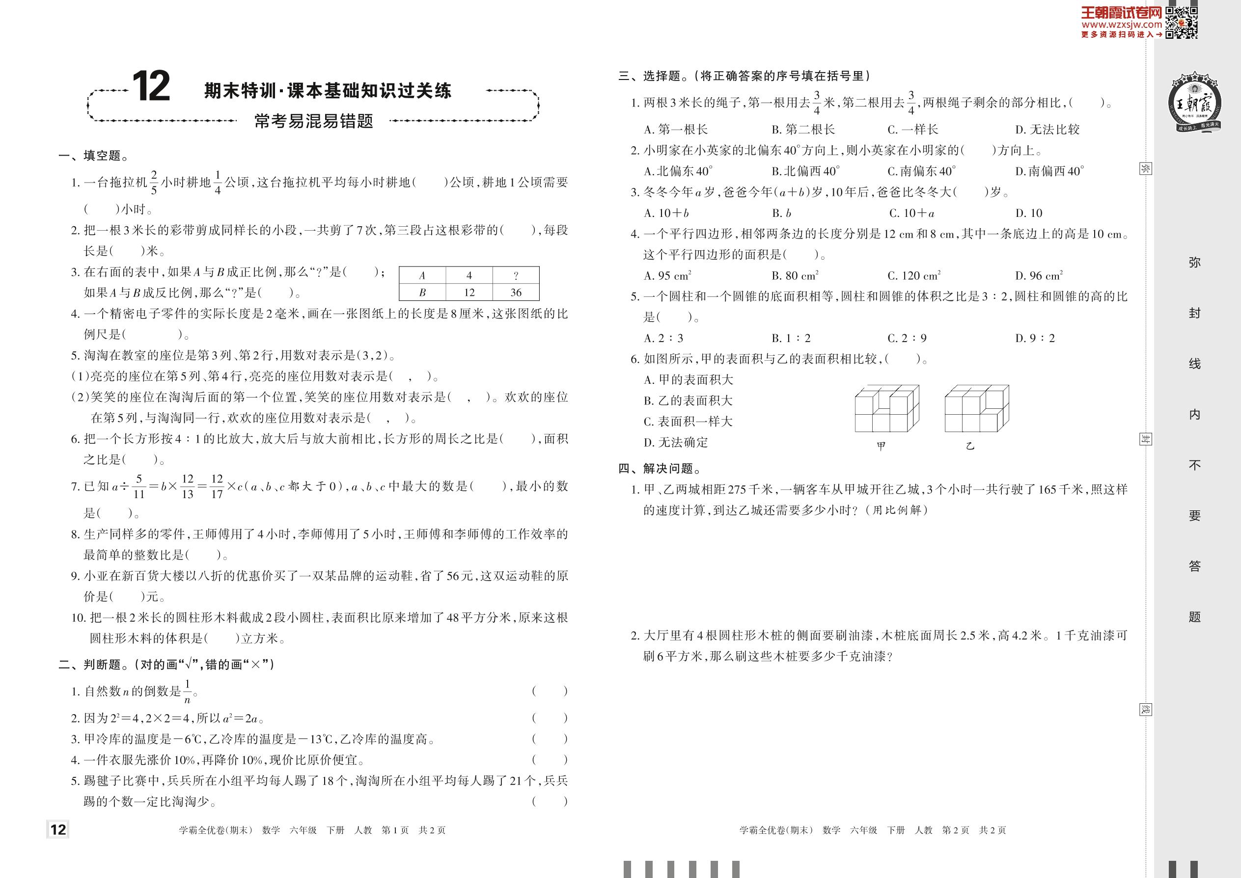 2023下册六年级数学人教版 12 期末特训·课本基础知识过关练——常考易混易错题