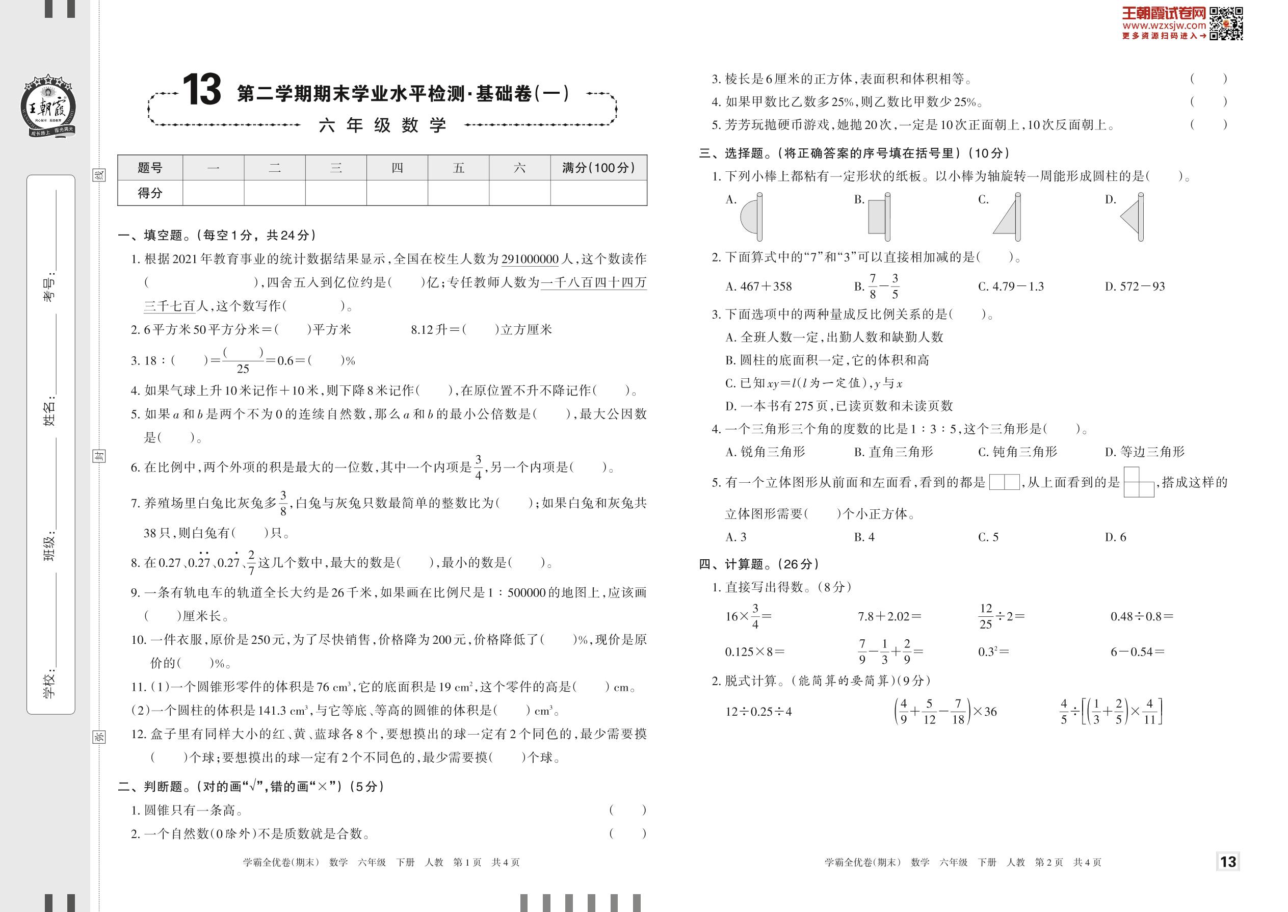 2023下册六年级数学人教版 13 第二学期期末学业水平检测·基础卷(一)