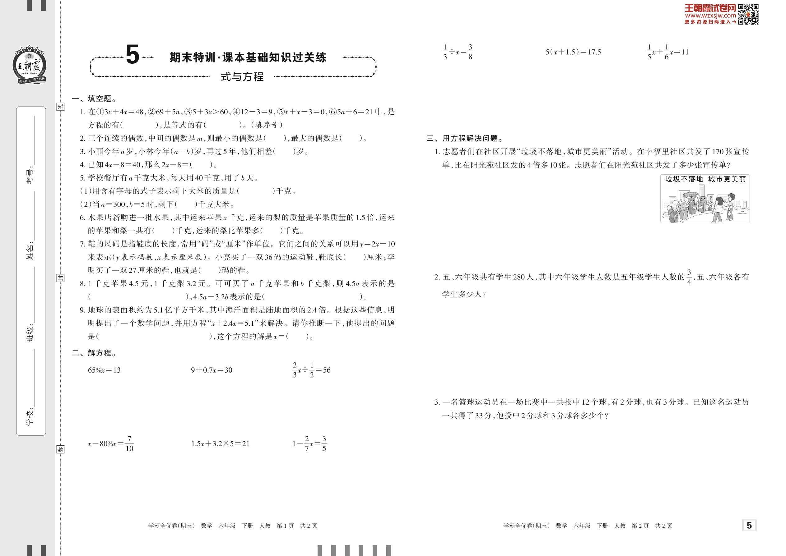 2023下册六年级数学人教版 5 期末特训·课本基础知识过关练——式与方程
