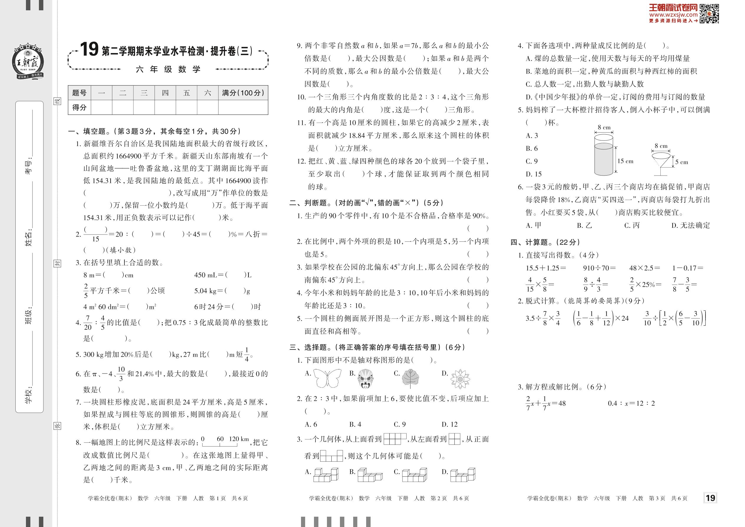 2023下册六年级数学人教版 19 第二学期期末学业水平检测·提升卷(三)