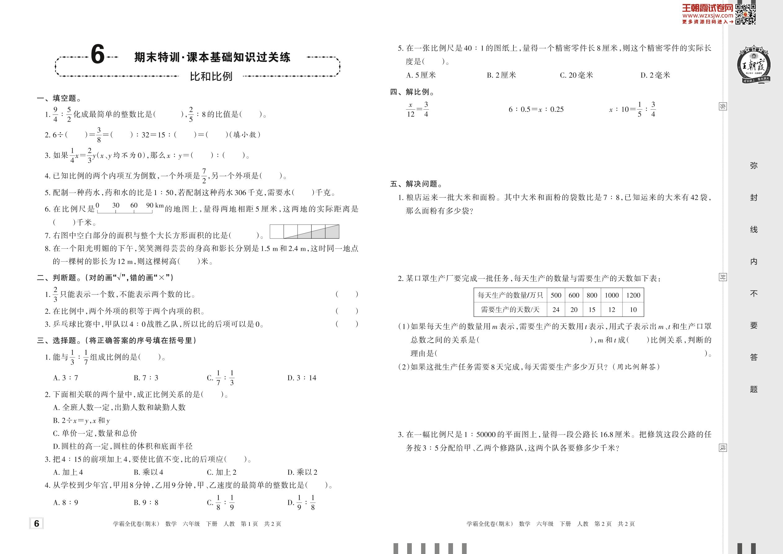 2023下册六年级数学人教版 6 期末特训·课本基础知识过关练——比和比例