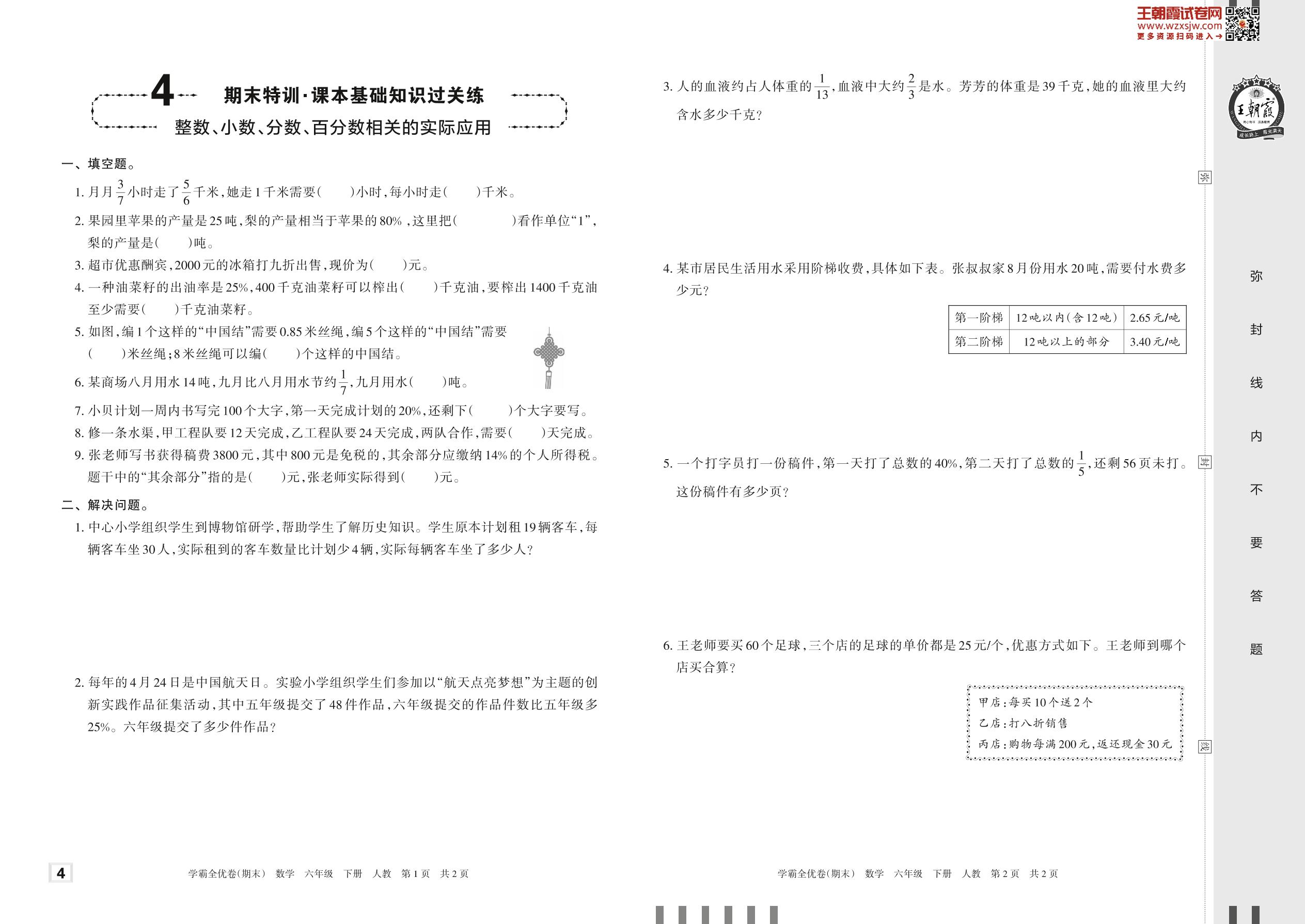 2023下册六年级数学人教版 4 期末特训·课本基础知识过关练——整数、小数、分数、百分数相关的实际应用