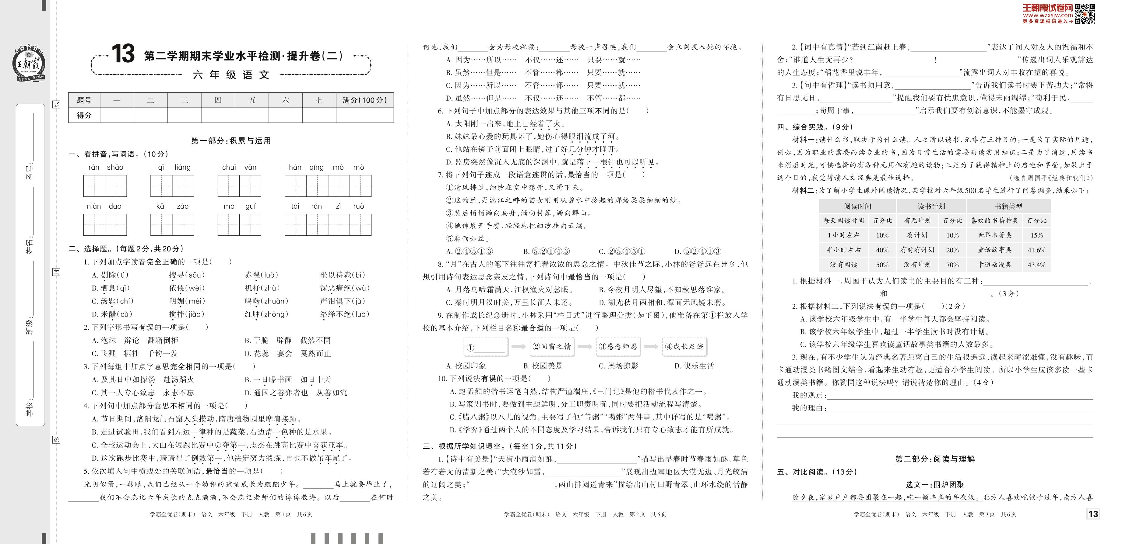 2023下册六年级语文人教版 13 第二学期期末学业水平检测·提升卷(二)
