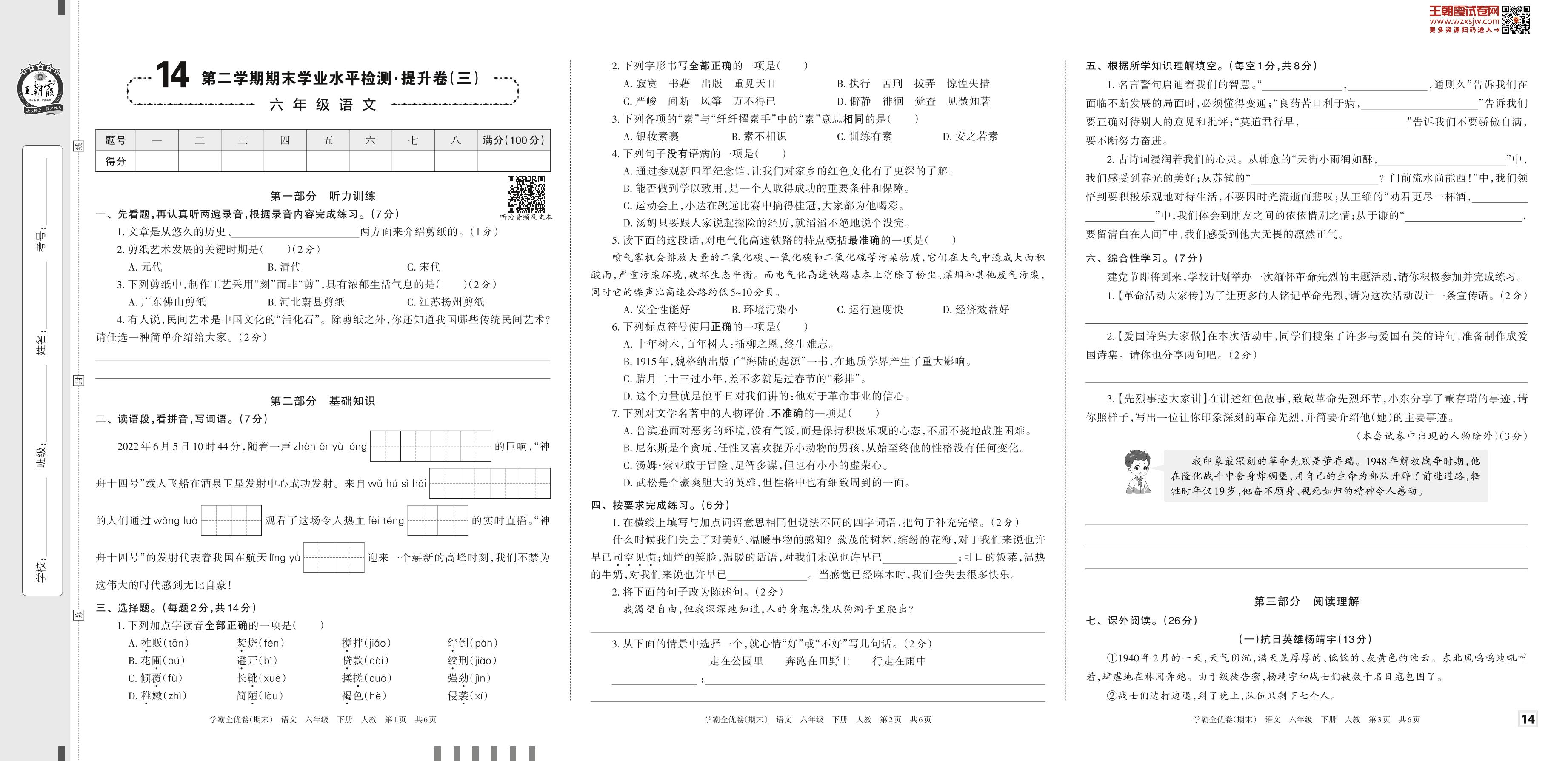 2023下册六年级语文人教版 14 第二学期期末学业水平检测·提升卷(三)