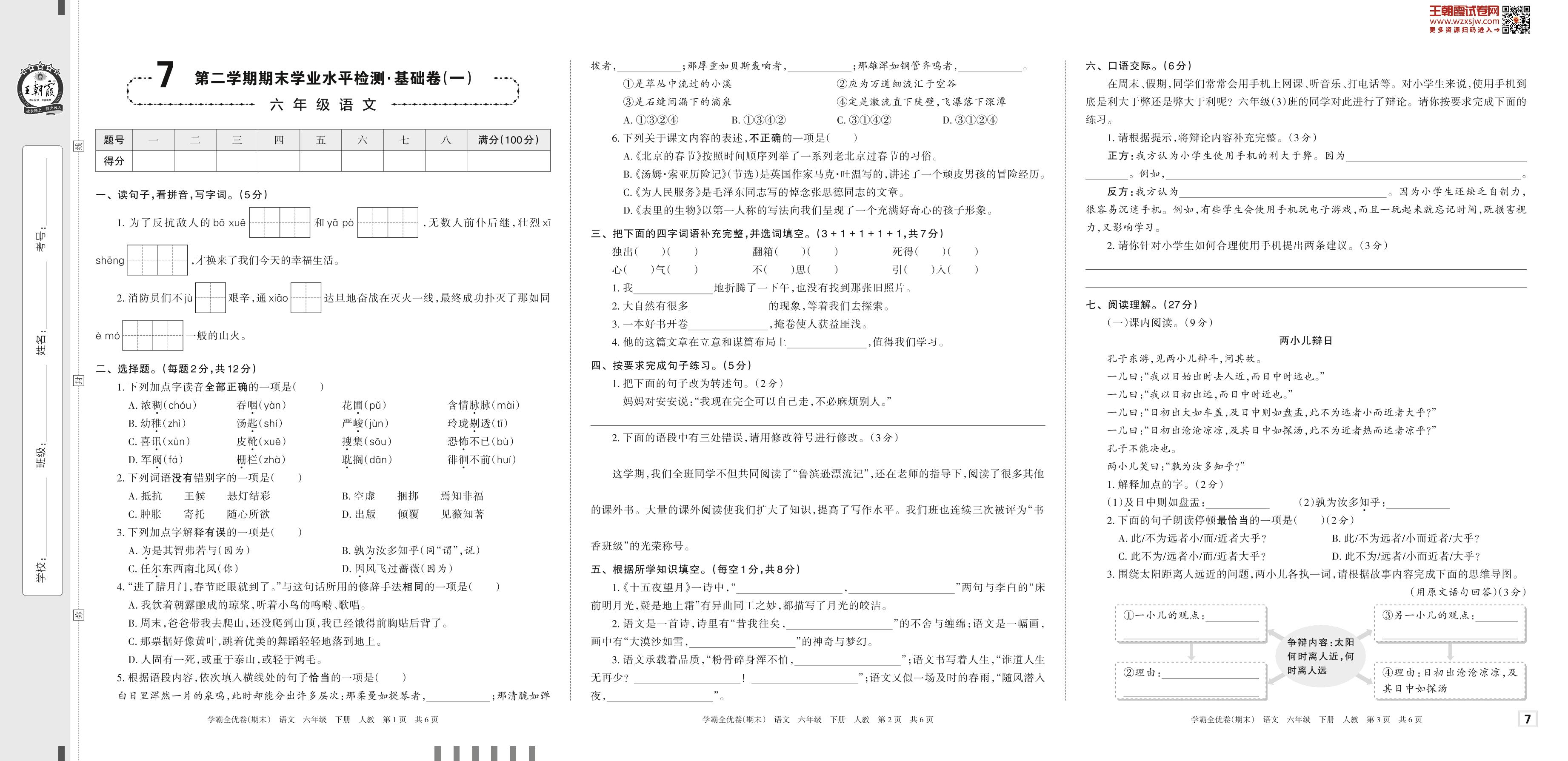 2023下册六年级语文人教版 7 第二学期期末学业水平检测·基础卷(一)