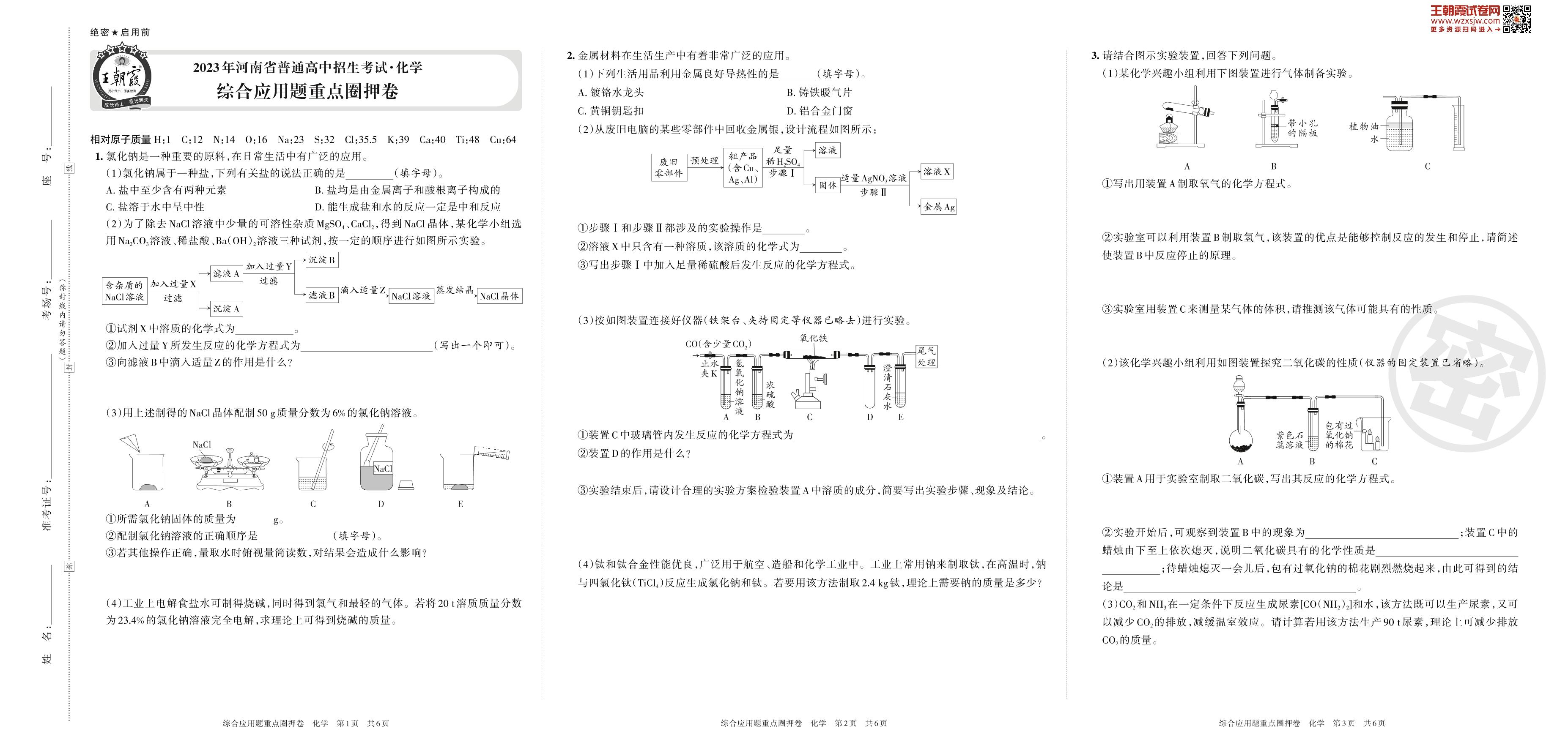 2023年河南省普通高中招生考试·化学 综合应用题重点圈押卷