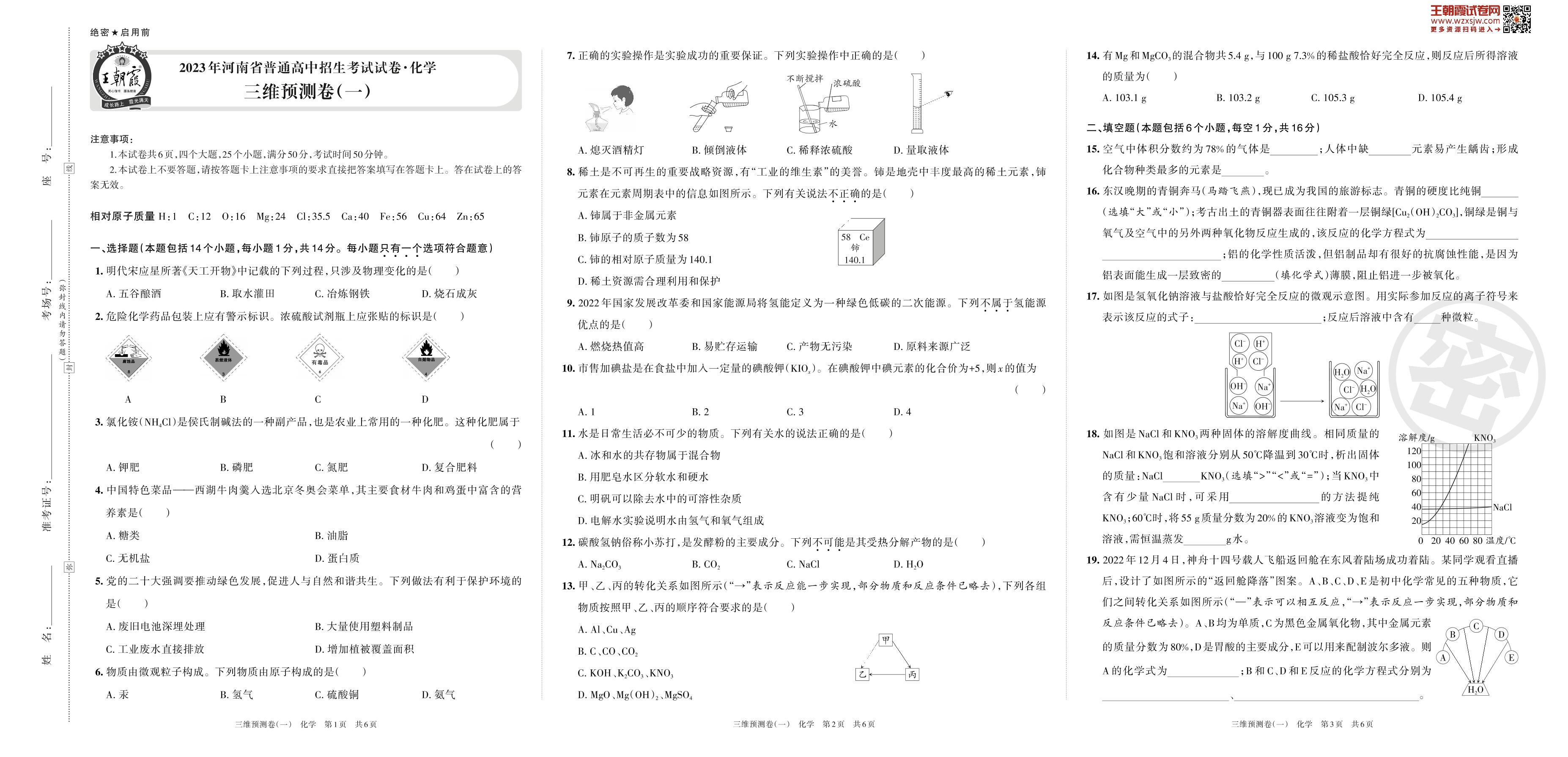 2023年河南省普通高中招生考试试卷·化学 三维预测卷(一)