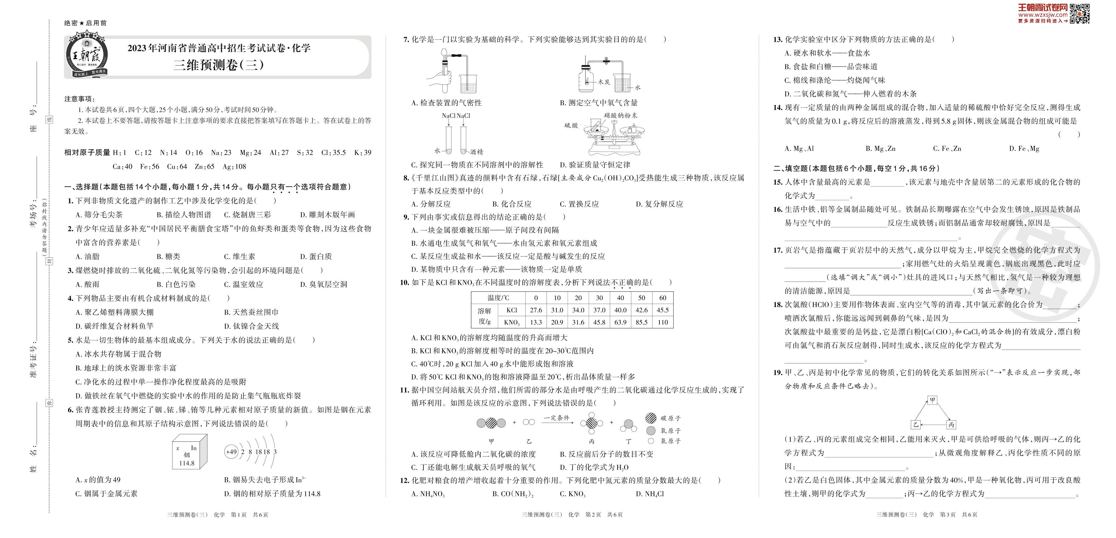 2023年河南省普通高中招生考试试卷·化学 三维预测卷(三)