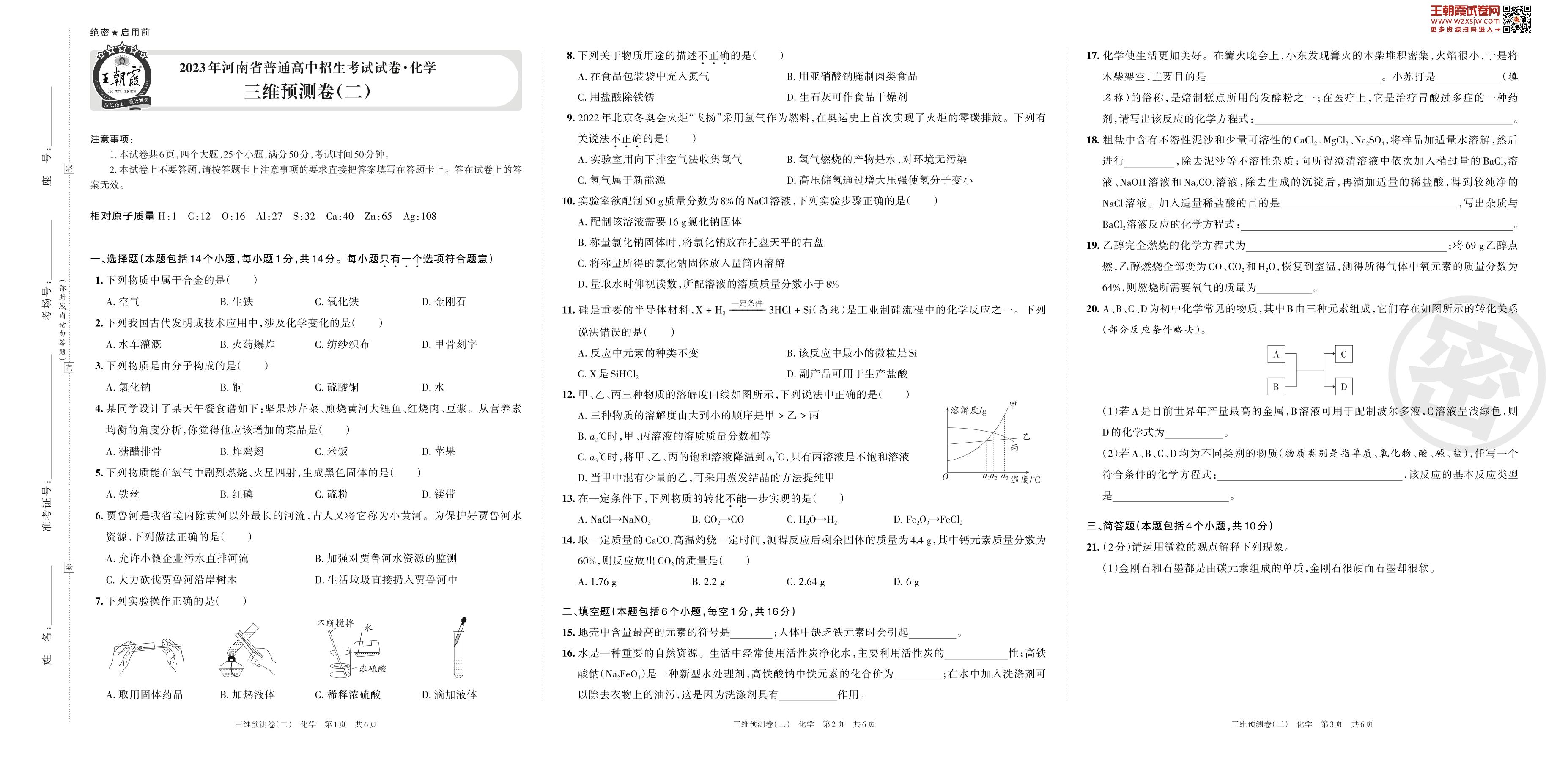 2023年河南省普通高中招生考试试卷·化学 三维预测卷(二)