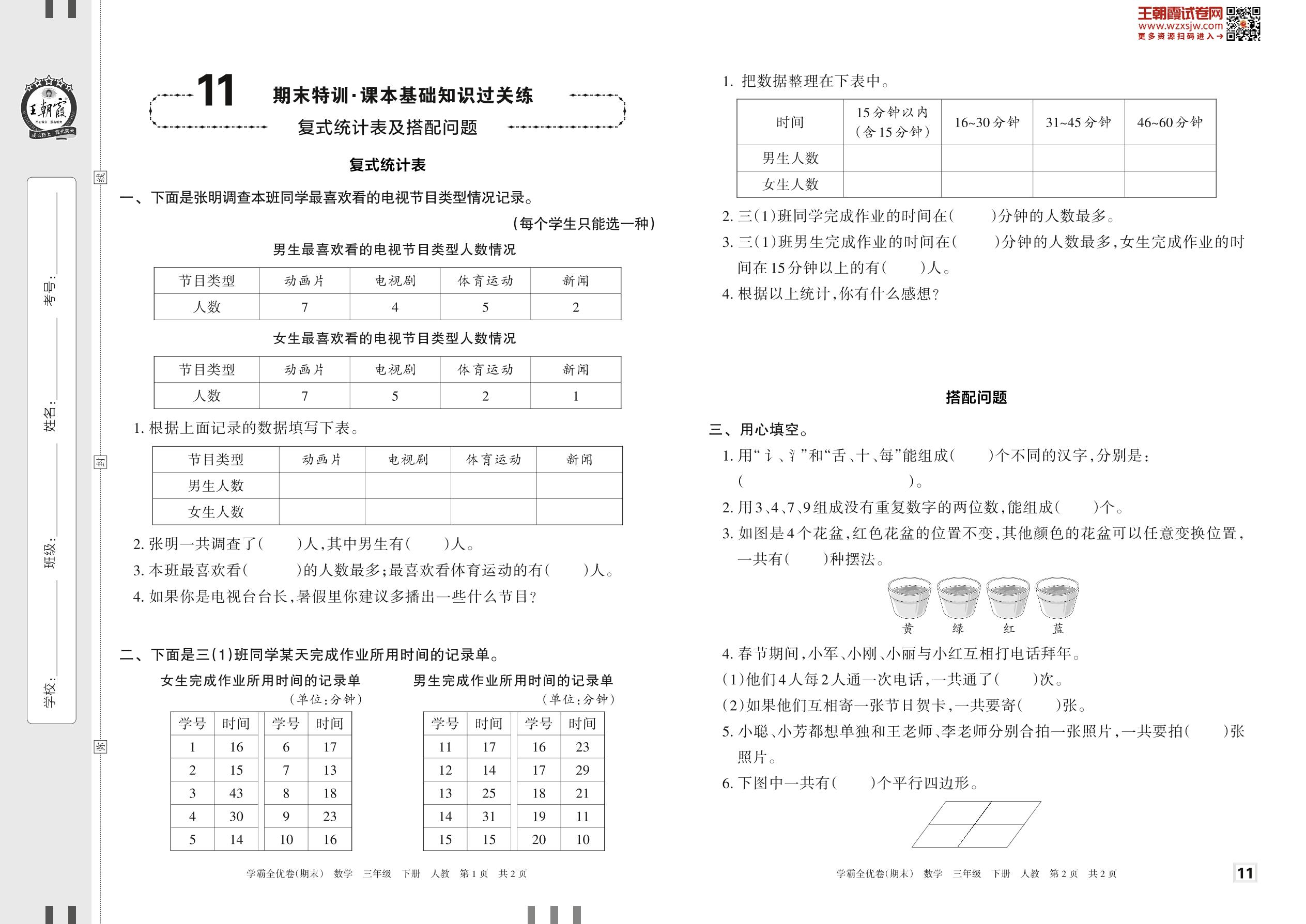 2023下册三年级数学人教版 11 期末特训·课本基础知识过关练——复式统计表及搭配问题