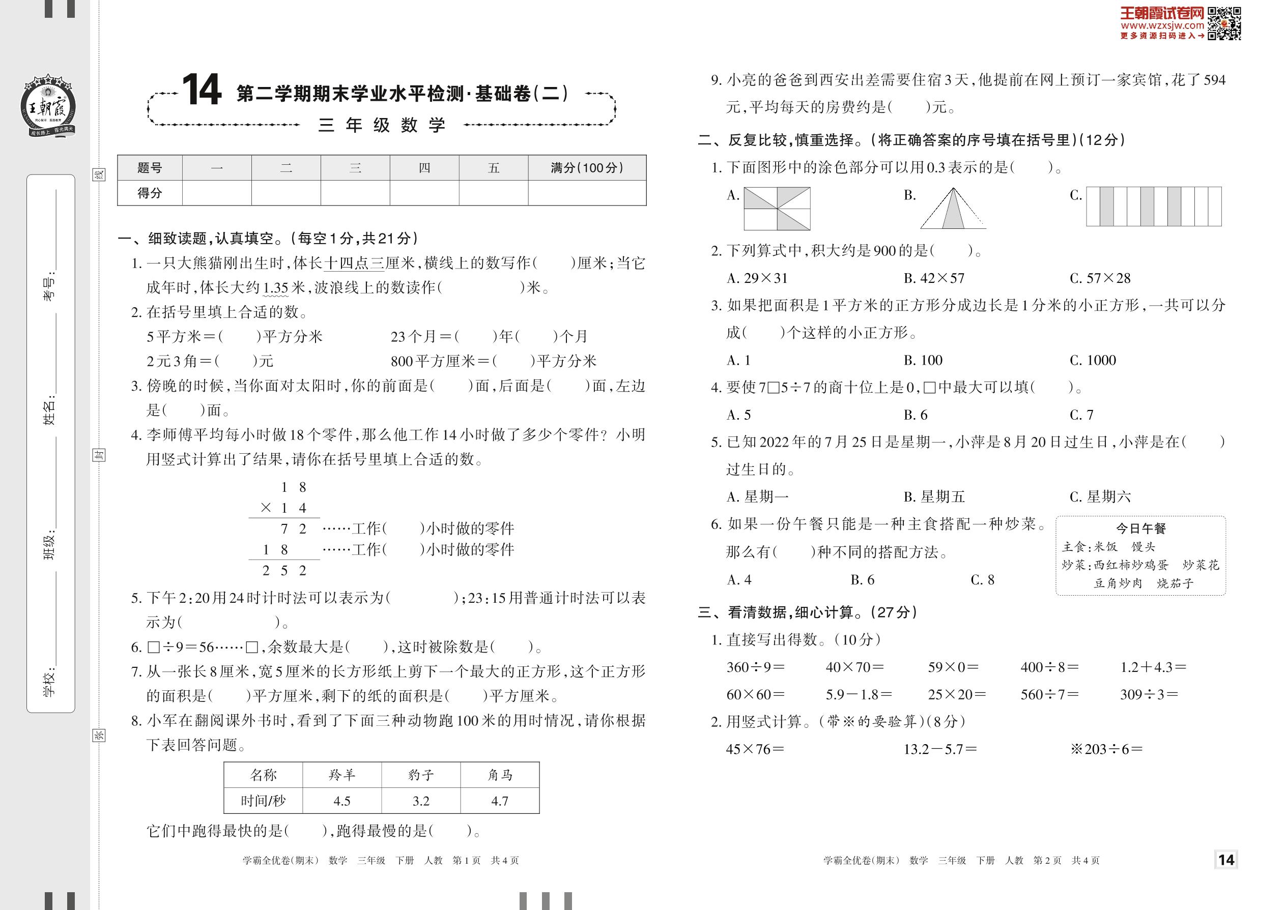 2023下册三年级数学人教版 14 第二学期期末学业水平检测·基础卷(二)