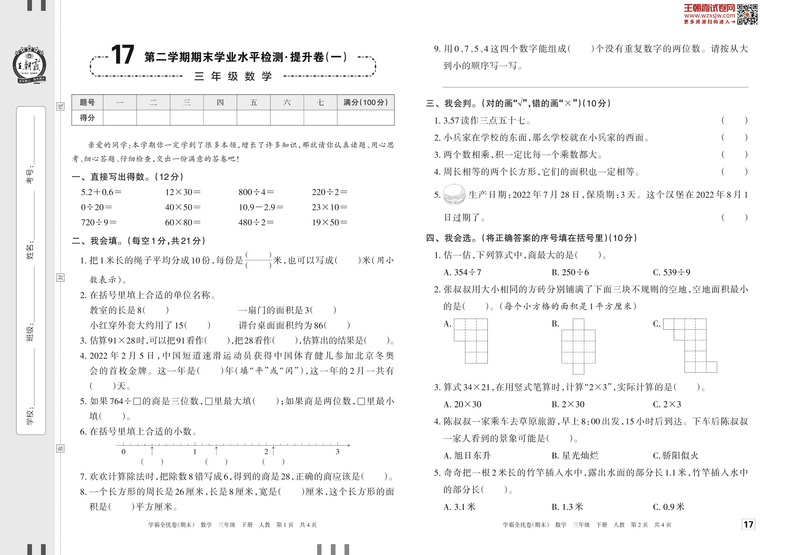 2023下册三年级数学人教版 17 第二学期期末学业水平检测·提升卷(一)