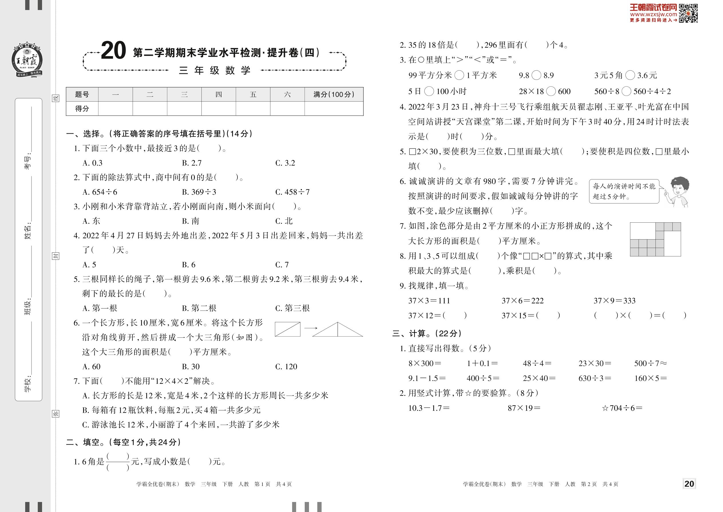 2023下册三年级数学人教版 20 第二学期期末学业水平检测·提升卷(四)