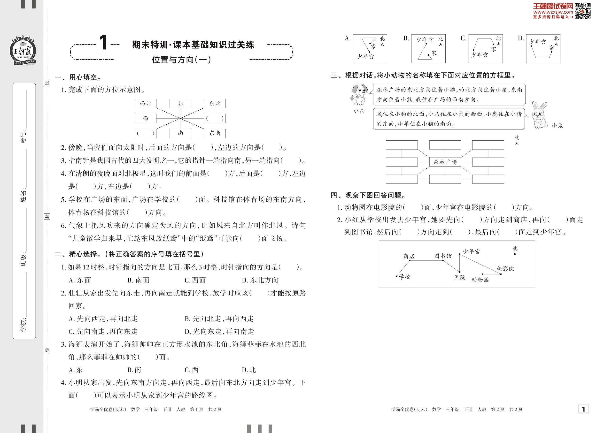 2023下册三年级数学人教版 1 期末特训·课本基础知识过关练——位置与方向(一)