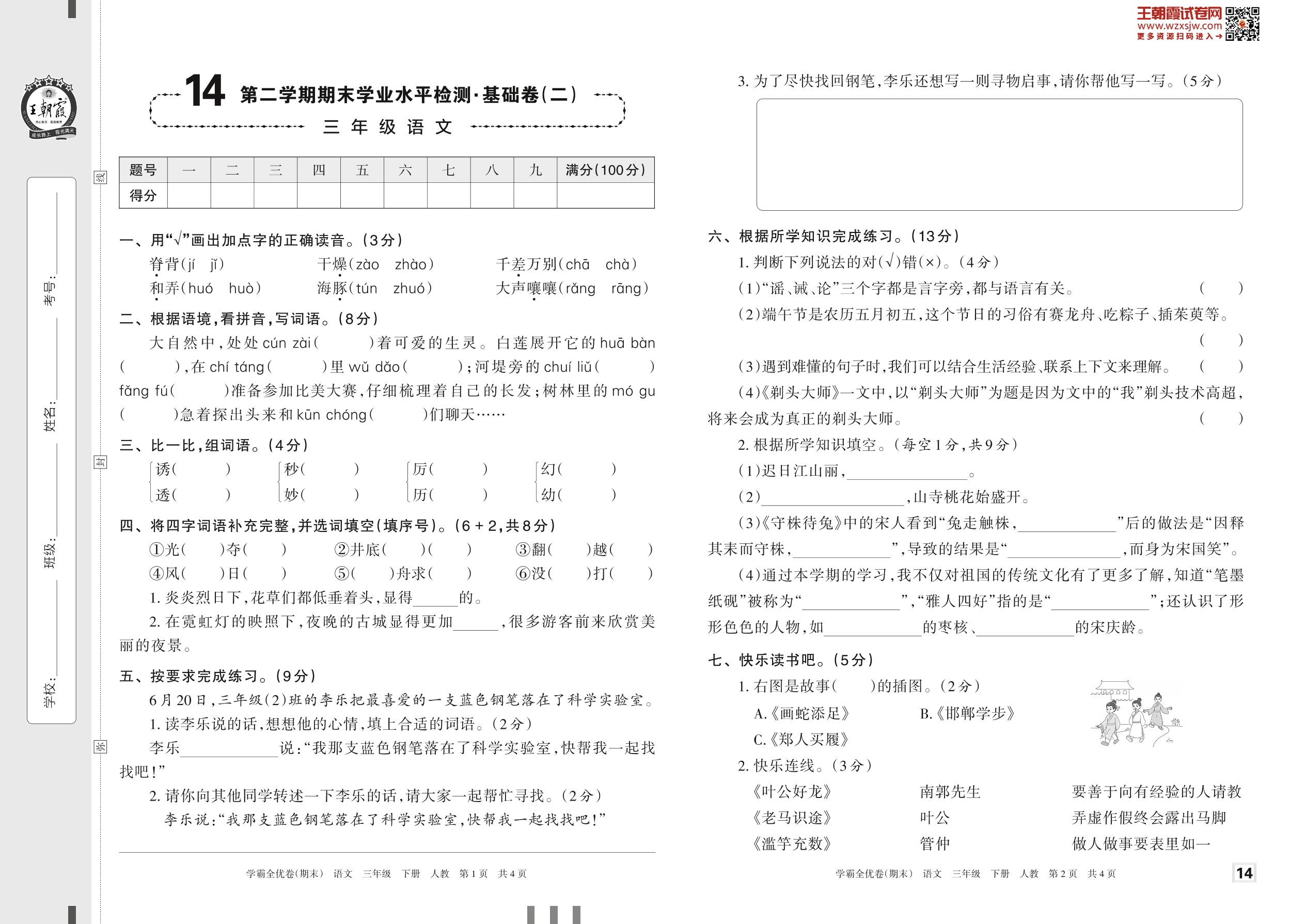2023下册三年级语文人教版 14 第二学期期末学业水平检测·基础卷(二)