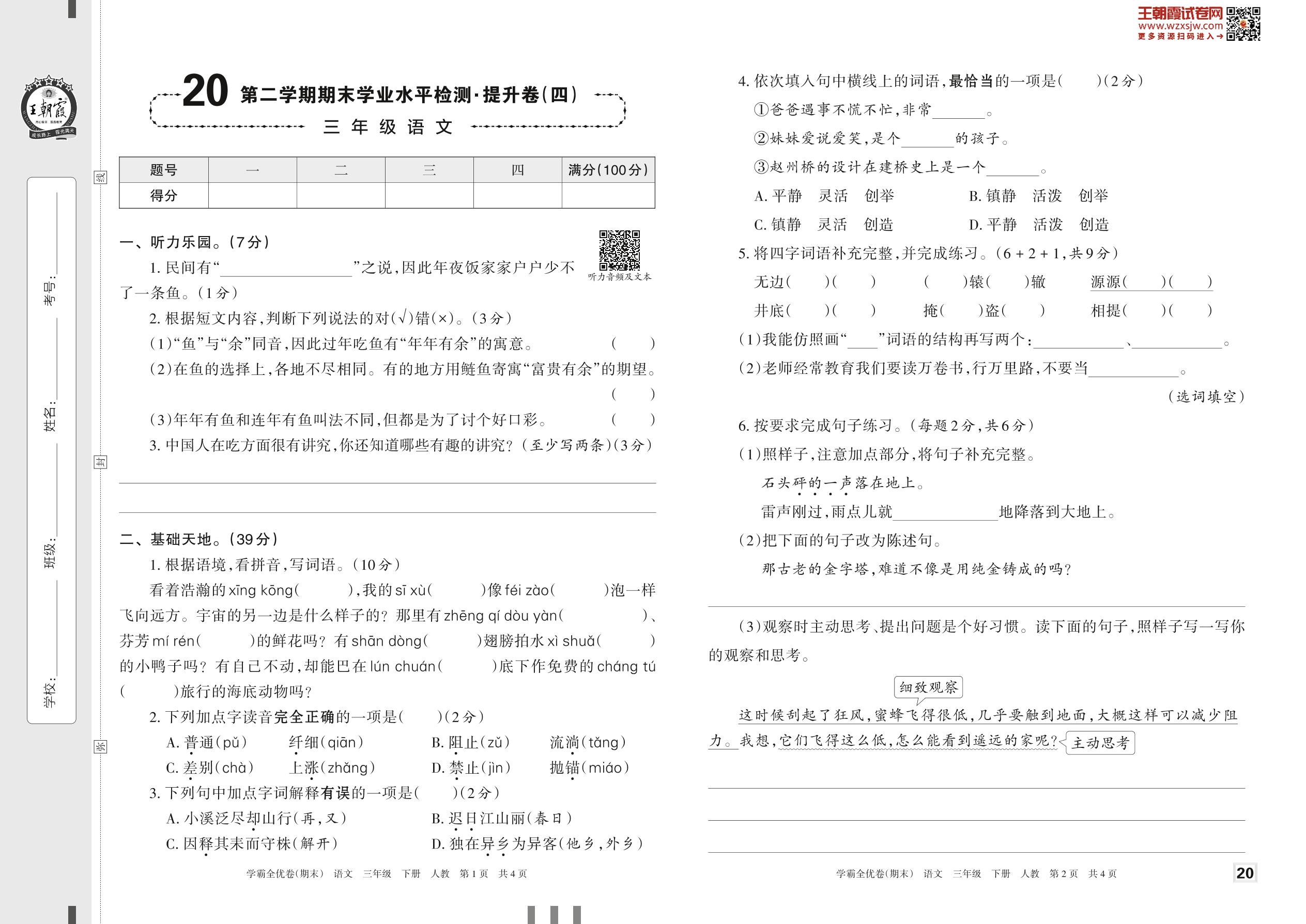 2023下册三年级语文人教版 20 第二学期期末学业水平检测·提升卷(四)