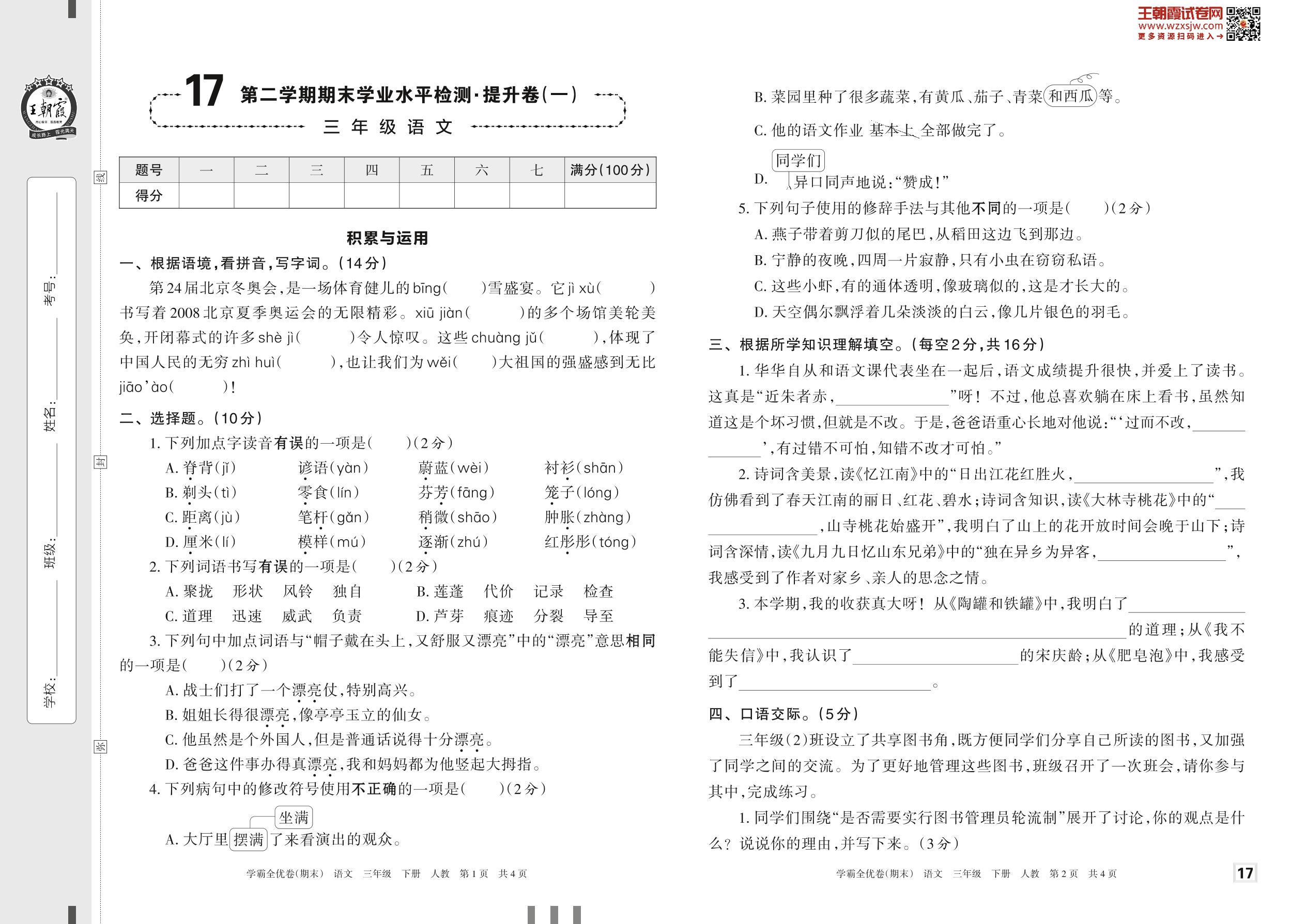 三年级语文人教版下册期末卷