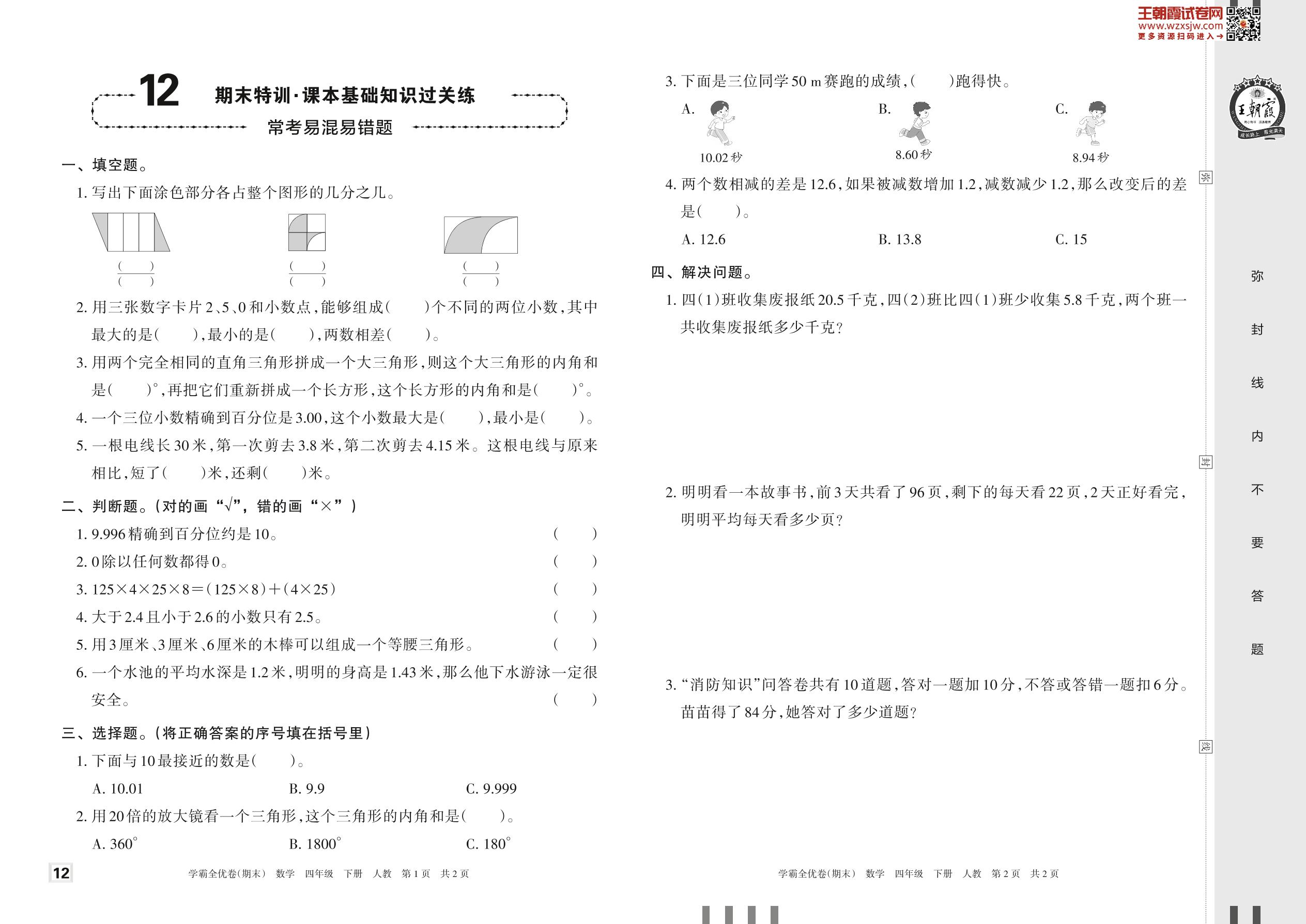 2023下册四年级数学人教版 12 期末特训·课本基础知识过关练——常考易混易错题