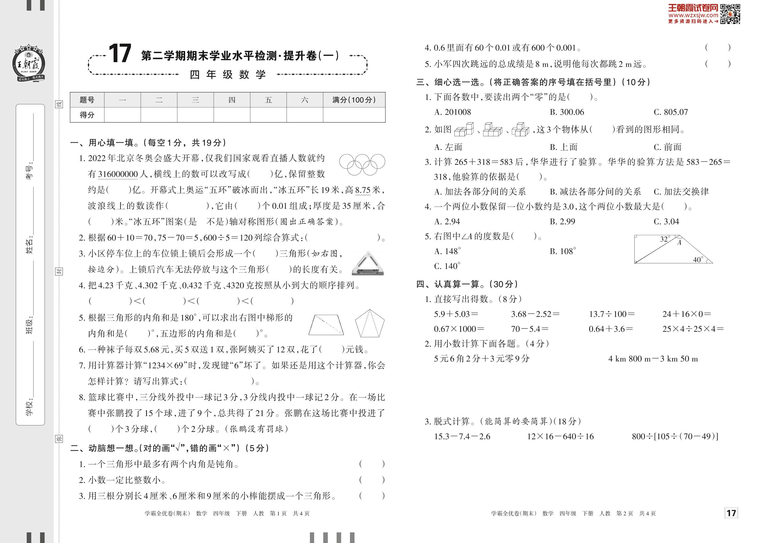 2023下册四年级数学人教版 17 第二学期期末学业水平检测·提升卷(一)